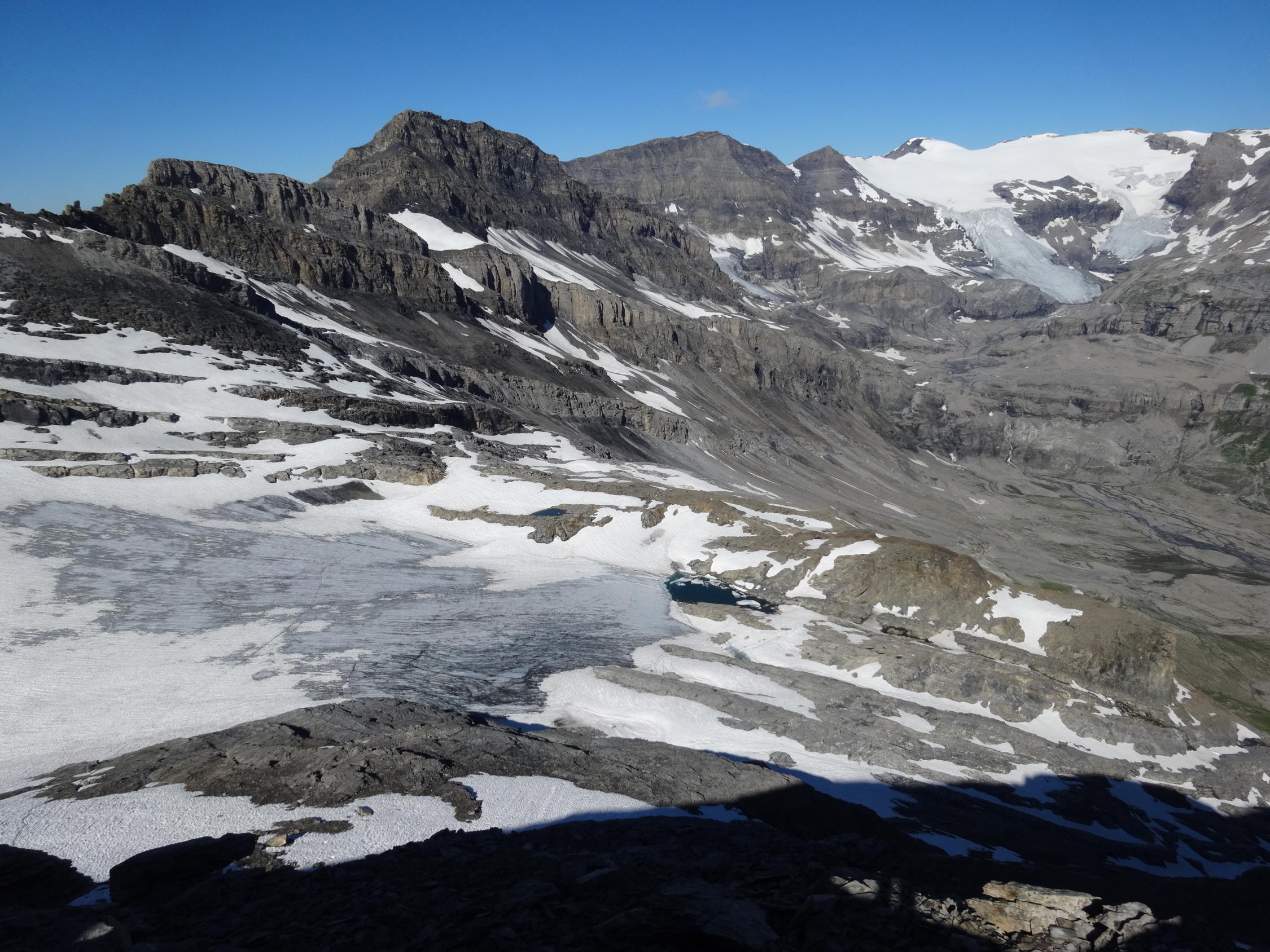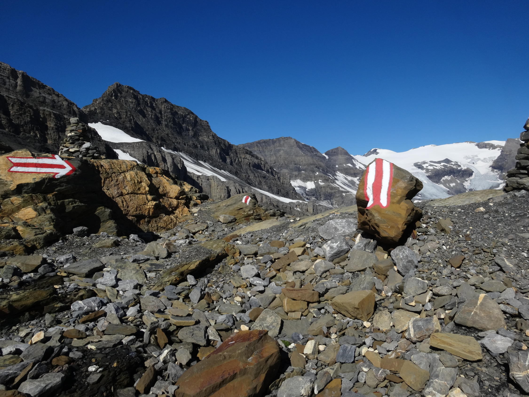 Gletscher im Abstieg über weite Strecken blank. Entweder Steigeisen oder einfacher, rechts und dann unten herum am Gletschersee vorbei und so die guten Markierungen des Wanderwegs wieder erreichen.