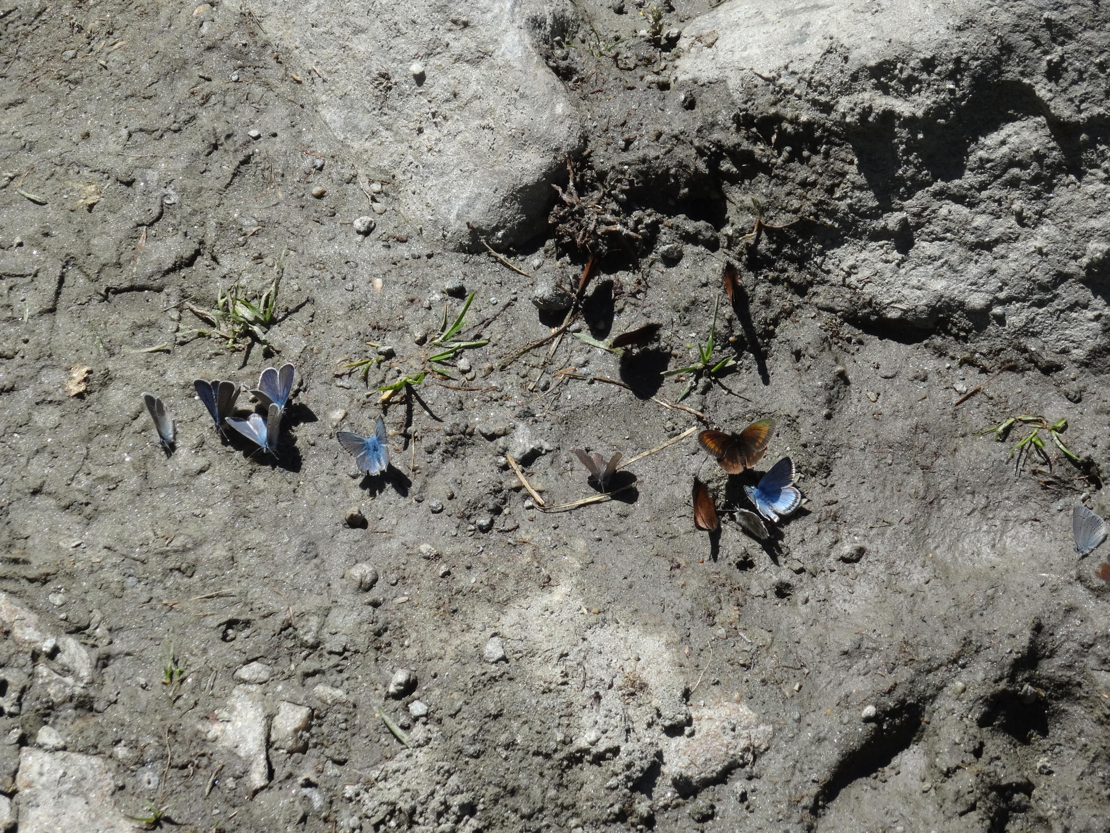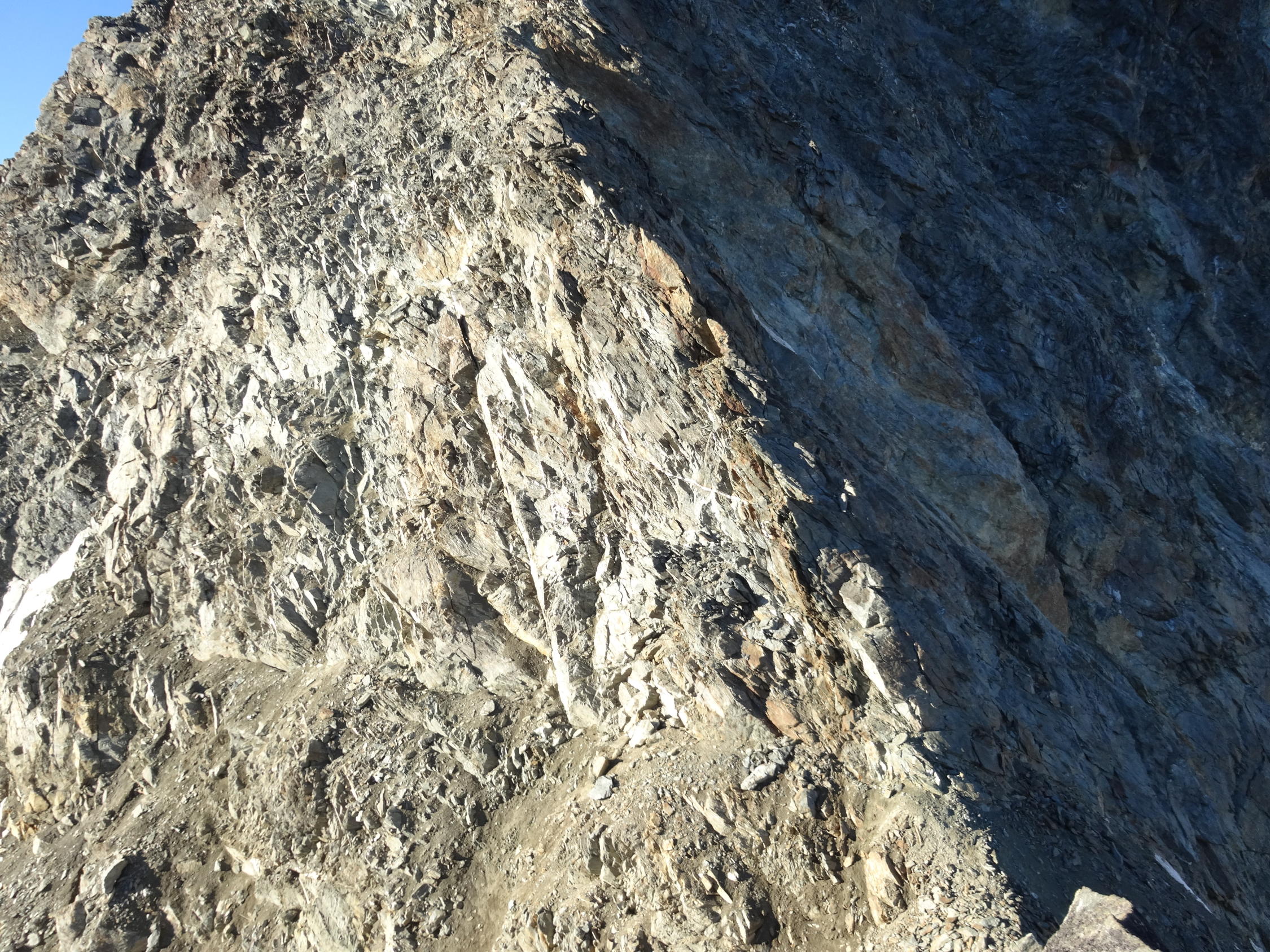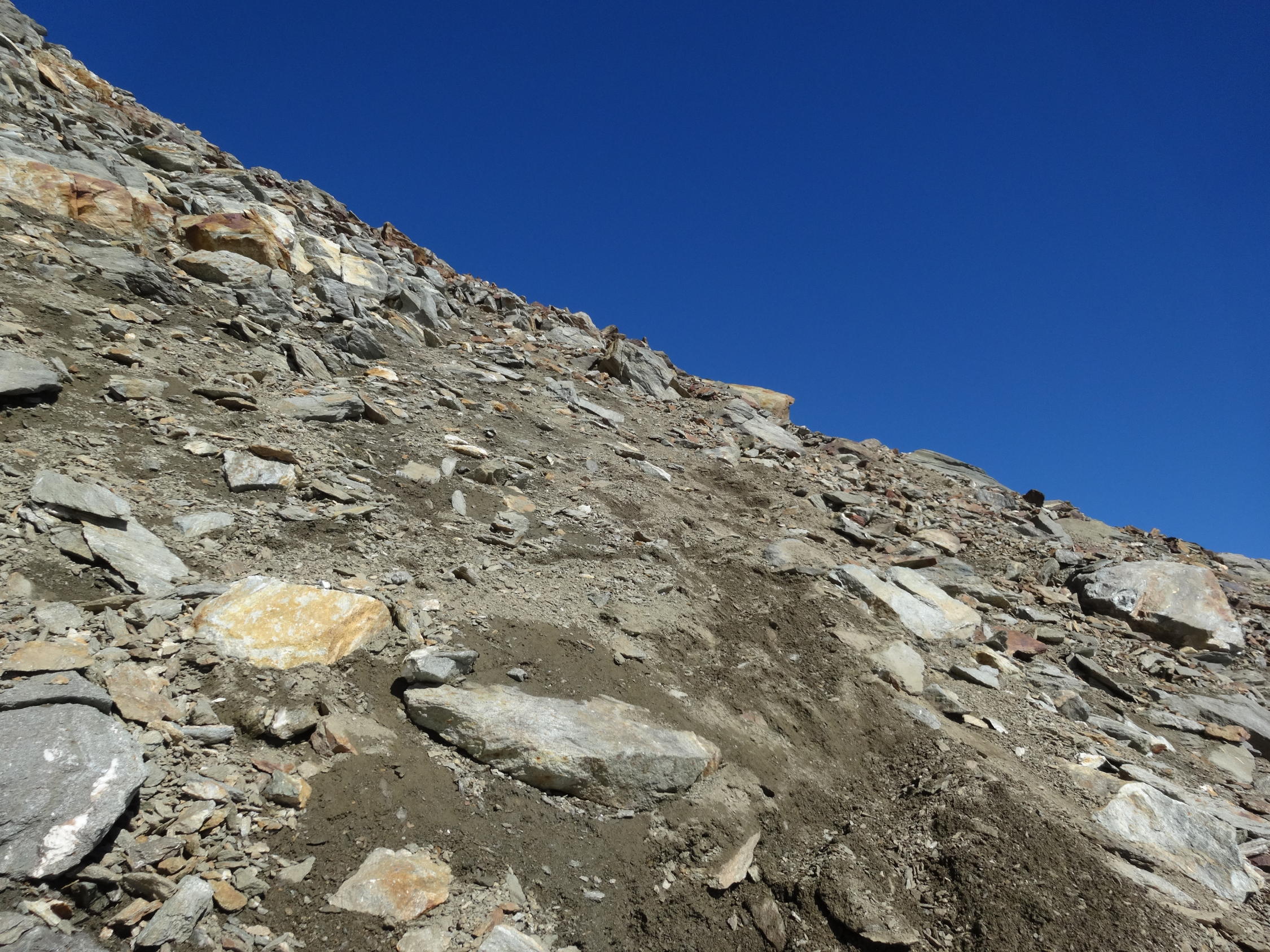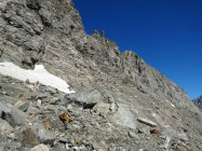 Im Abstieg sind wir direkt ostwärts über die kurze Schutt-Felsrippe runter. Hier haben sich oberhalb für zwei, drei Meter erste blanke Stellen gezeigt.