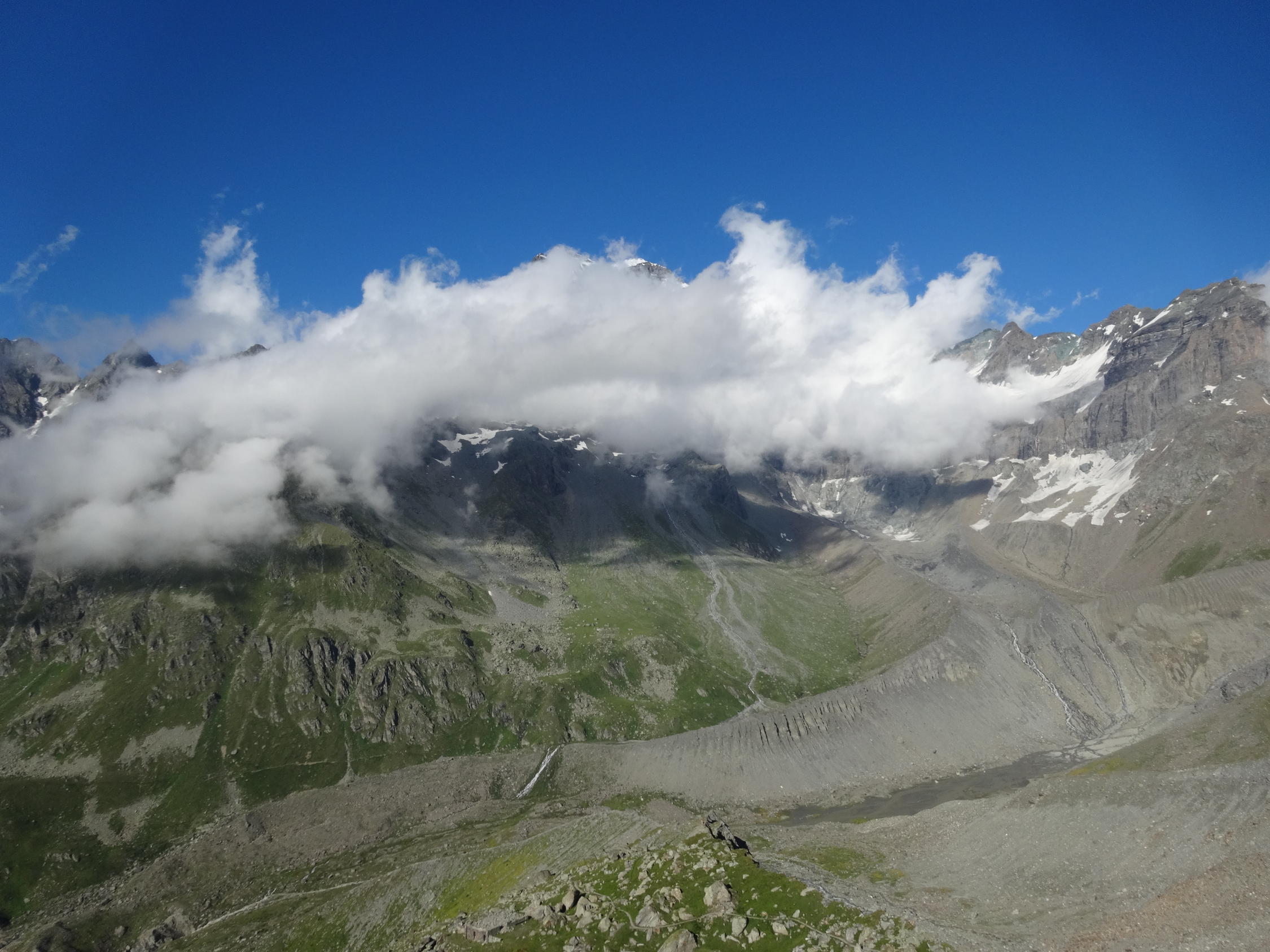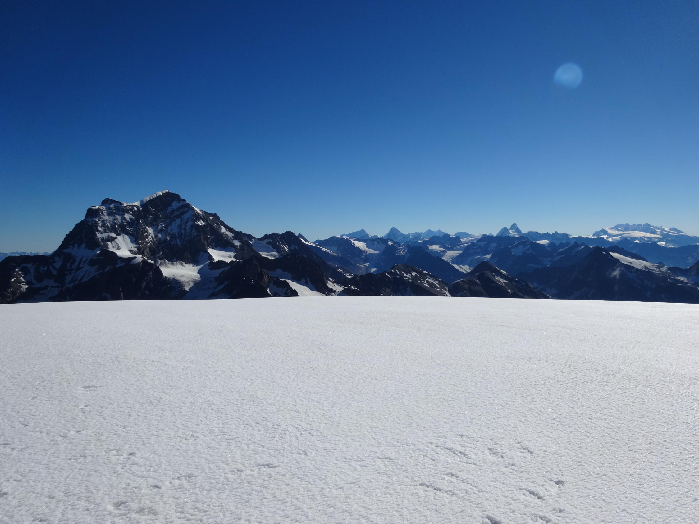 Die Aussicht auf dem Mont Velan ist beeindruckend. Direkt davor der Grand Combin, im Hintergrund die Walliser Berge und auf der anderen Seite das Mont Blanc Massiv. Man erkennt sogar den Genfersee und das "übliche" Nebelmeer in der Po-Ebene. Alleine wegen der Gifpelaussicht lohnt sich dieser Gipfel.