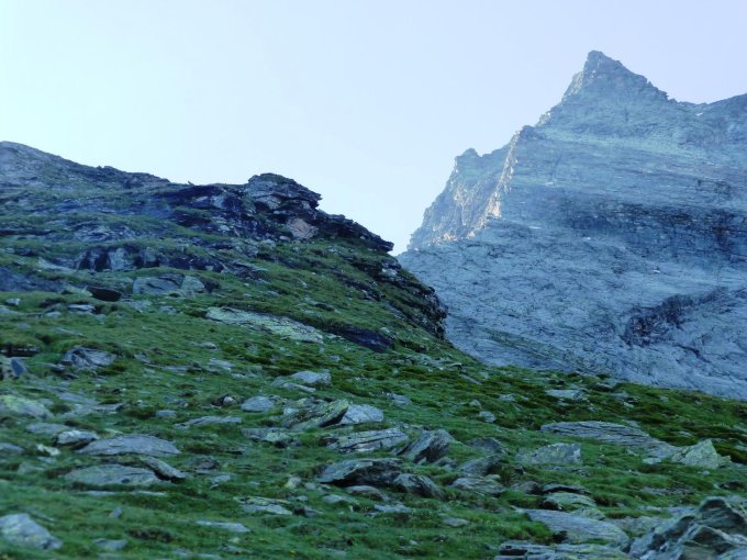 Am besten bleibt man möglichst immer auf der Gratkante. Es gibt 1-2Stellen in der man sich gerne in die Flanke abdrängen lässt, dort ist aber sehr viel Schotter und Bruch. Muss sehr viel selber abgesichert werden.