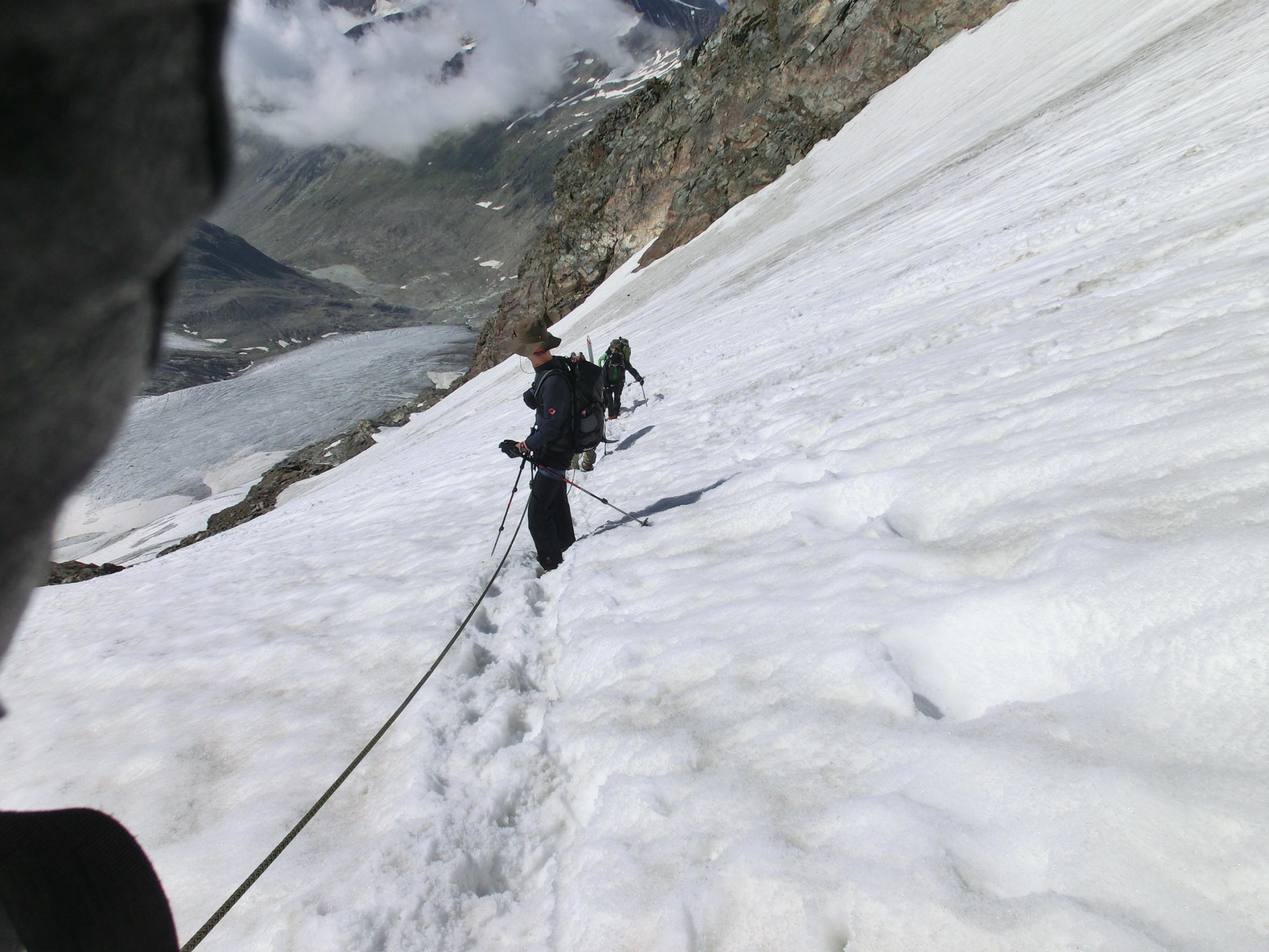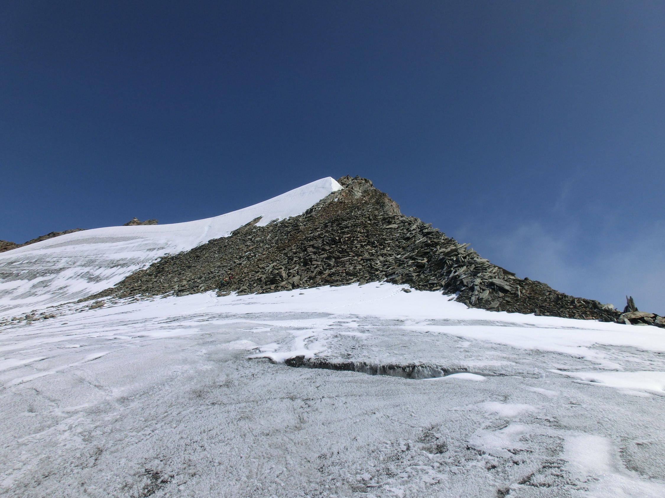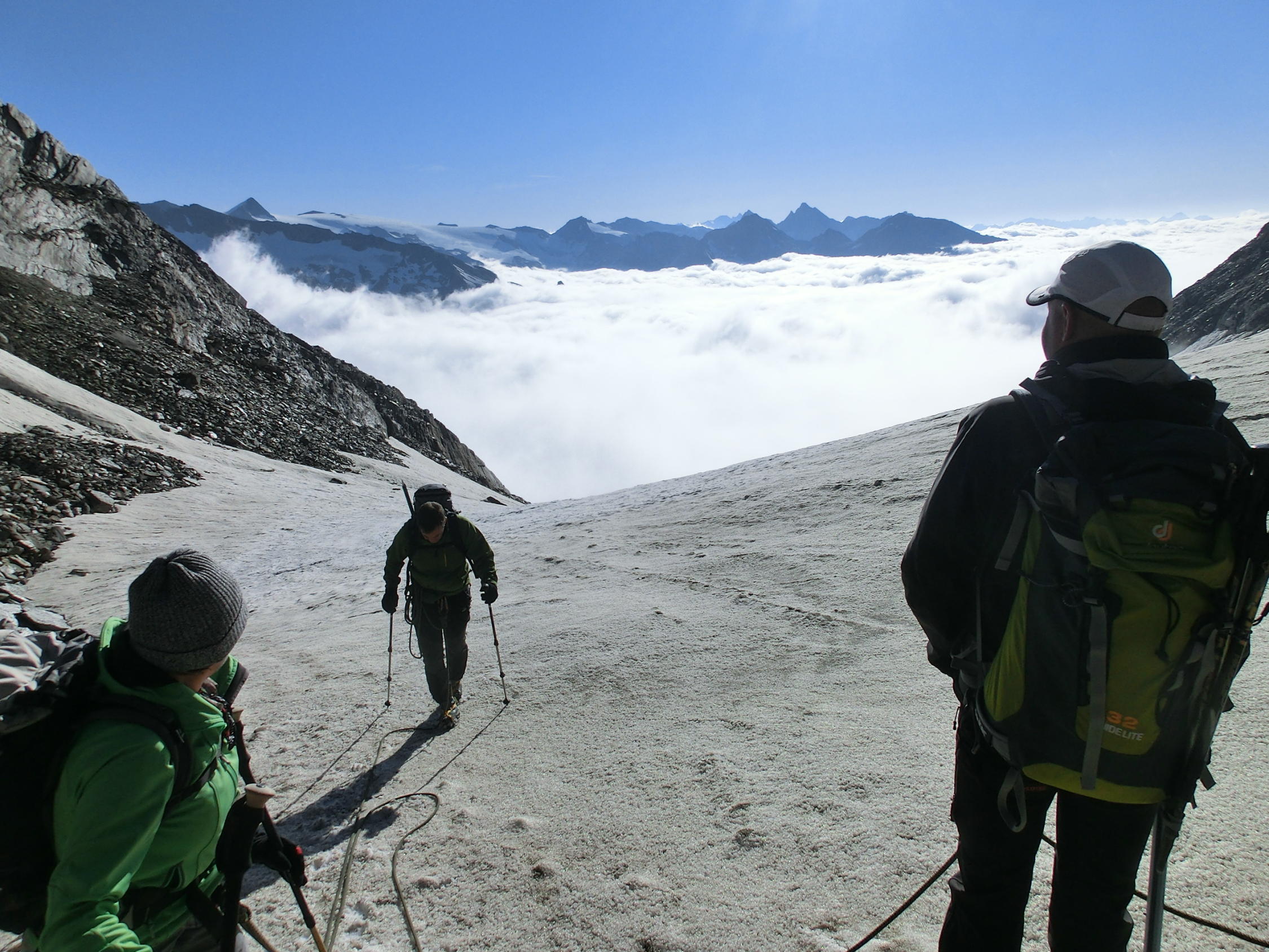 noch viel Schnee auf dem Umbalkees, daher waren die meisten Spalten noch gut bedeckt; eine meist problemlose Spur konnten wir wählen; auch die Firnflanke hatte guten Trittfirn; insgesamt daher sehr gute Verhältnisse momentan;