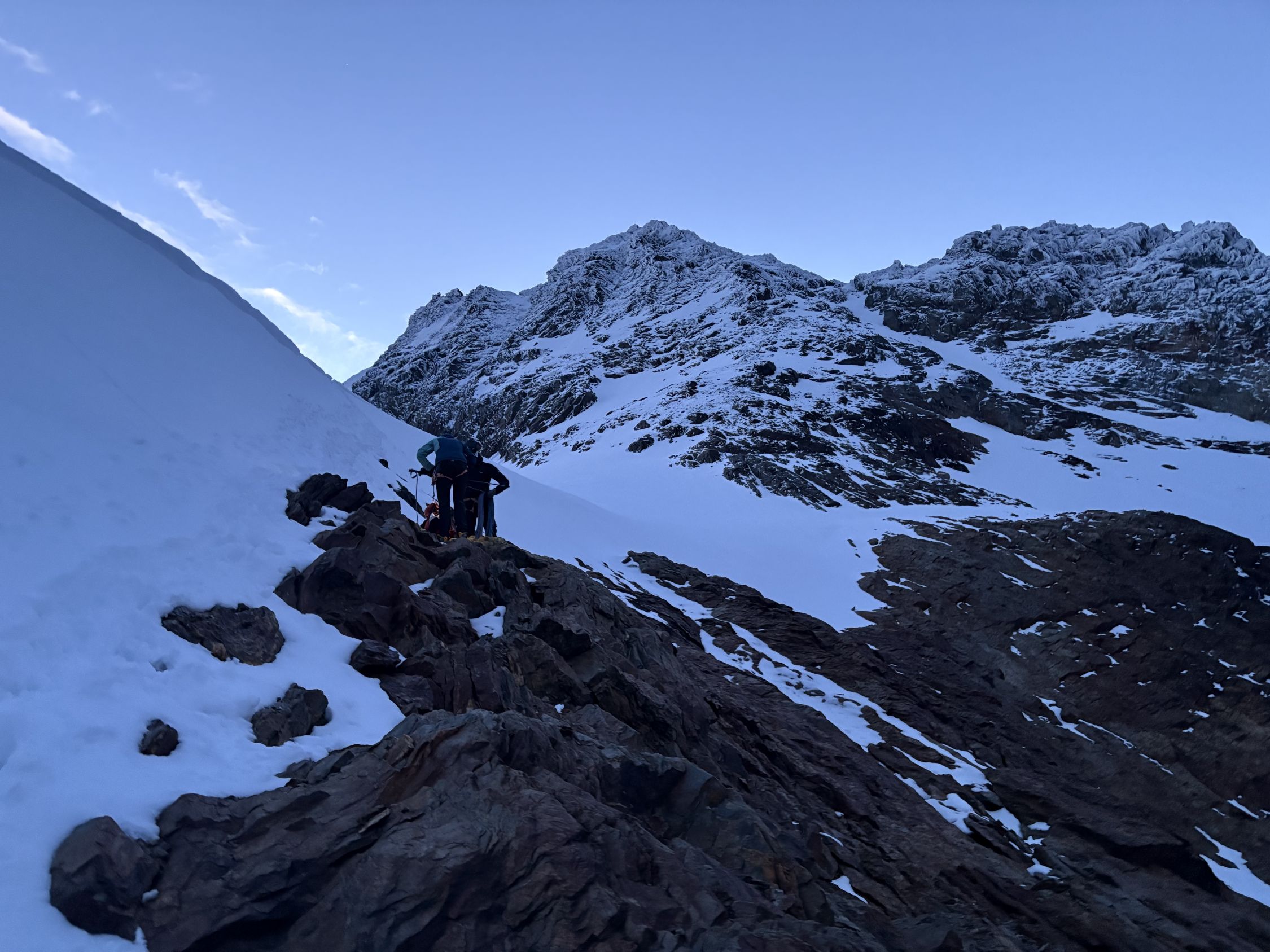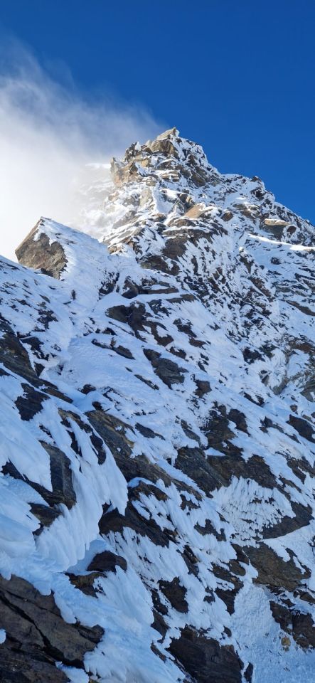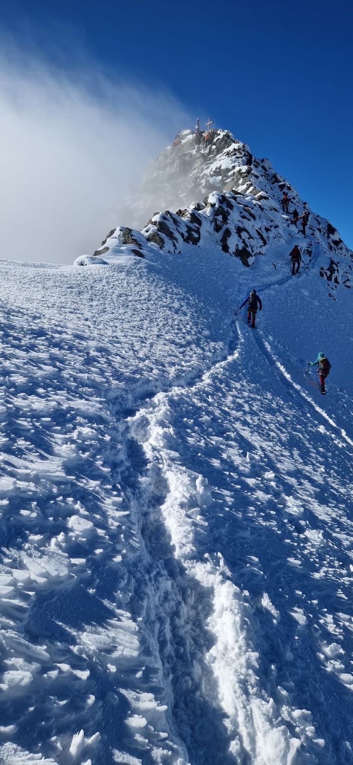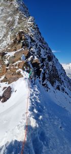 - Im Nordgrat vom Lagginhorn ist noch gut Schnee vorhanden. Dieser ist aber überwiegend verdichtet und Tritte und Griffe wo nötig von Eis befreit. Sicher schwieriger als sonst um diese Jahreszeit, aber machbar.
