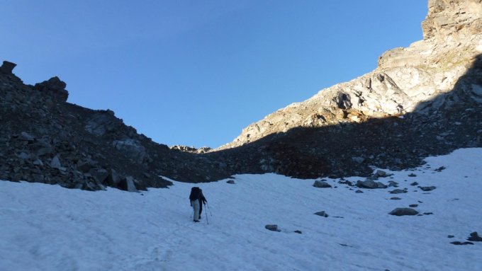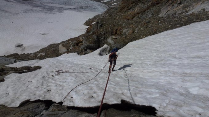 Die lange Tour mit Zustieg von der Tübinger Hütte setzt stabiles Wetter voraus. Dieses war uns an dem Tag auf das herrlichste beschieden. Die Route ist bestens eingerichtet. Für eine allfällige zusätzliche Absicherung genügen ein paar mittlere Camelots und Bandschlingen. Alle Standplätze sind eingebohrt. Das steile Schneefeld im Ausstieg von der Absteilstelle kann auch abgeseilt werden. Wir haben das auch getan, nachdem ich einen Kletterer rasant über dieses Schneefeld in das darunterliegende Geröll 'rodeln' sah. Ihm ist zum Glück nichts gröberes passiert.