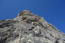 Im oberen Teil hat es zwei Seillängen mit plattigen Stellen im Grad 5c. Mit hohen Schuhen sind diese recht anspruchsvoll. Mit zwei, drei A0-Zügen aber problemlos auch in hohen Schuhen zu meistern.