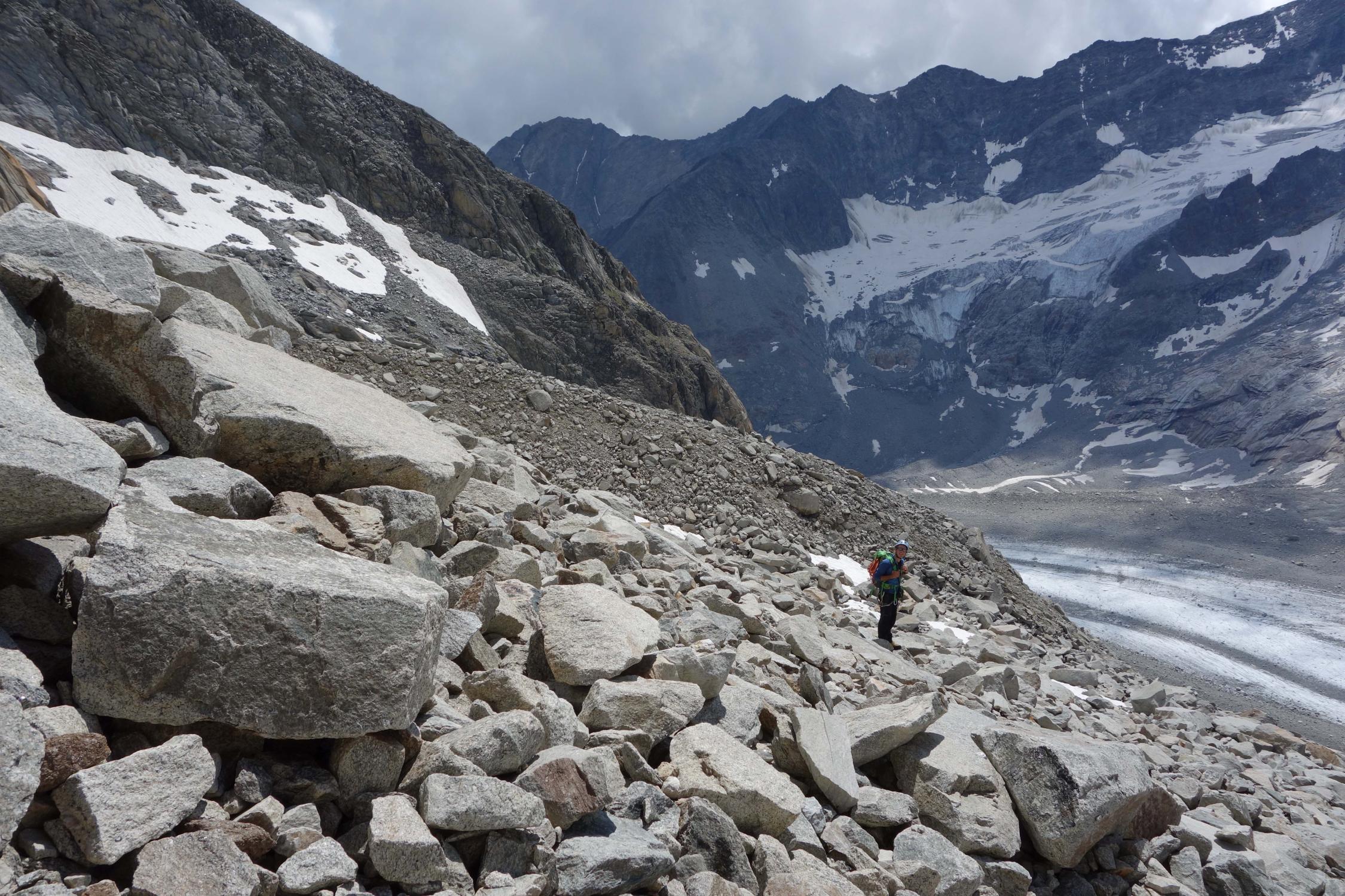 Wir haben den Abstieg über die West/Südwestflanke gewählt, weil wir kein 50m Doppelseil zum Absteilen über die Abseilpiste dabei hatten. Dieser Abstieg ist zwar möglich, er erfordert aber eine gute Nase für die Wegfindung und führt über steiles Gelände mit Gletscherschliffplatten und viel Geröll, das in Bewegung ist.