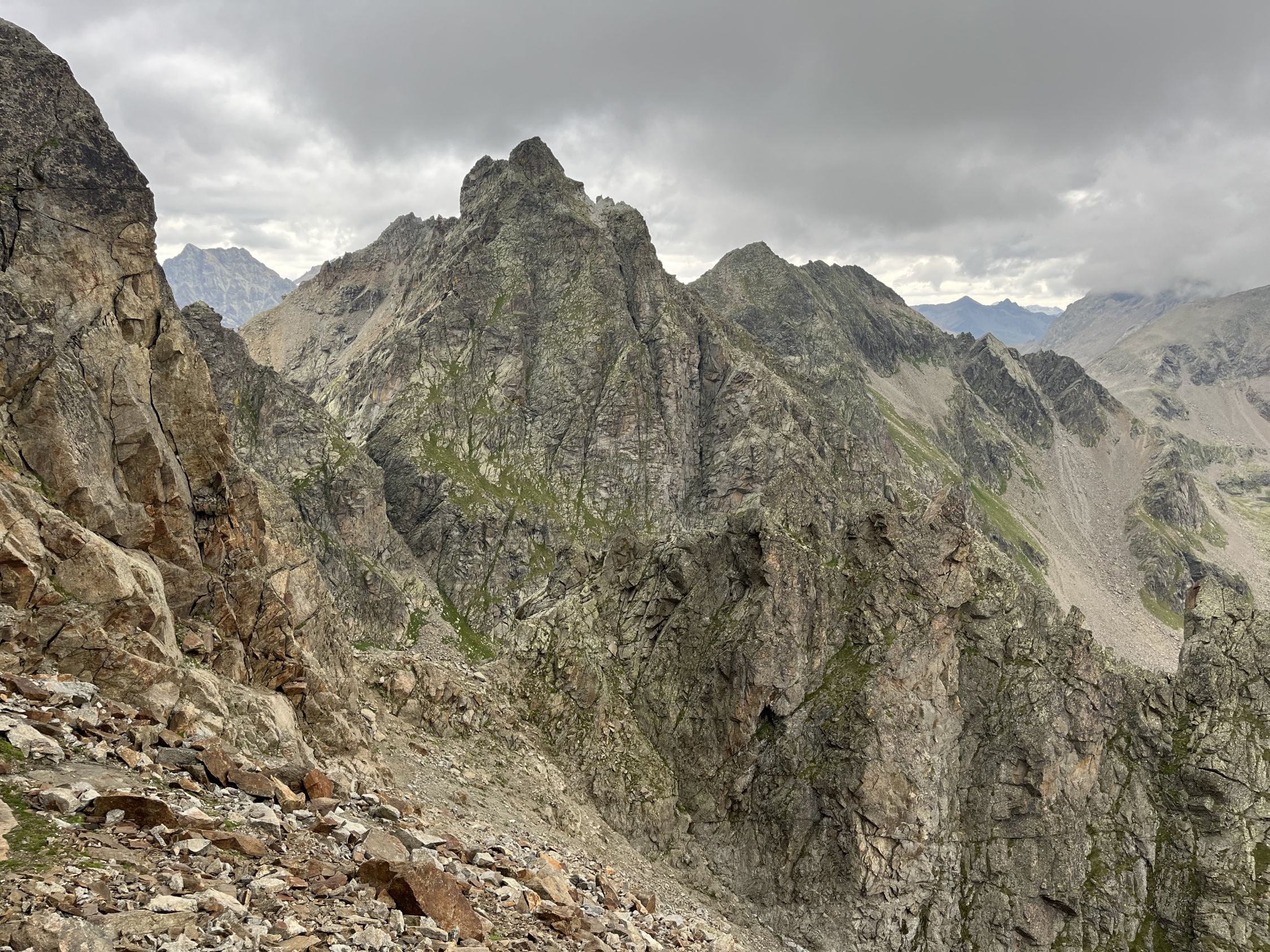 Dies ist vermutlich die technisch einfachste Route aufs Puschlaver Matterhorn, in den SAC-Führern nicht erwähnt. Alles bestens und trocken. Begangen als Abstecher von einer Querung von Saoseo zum sehr empfehlenswerten Rifugio Malghera.