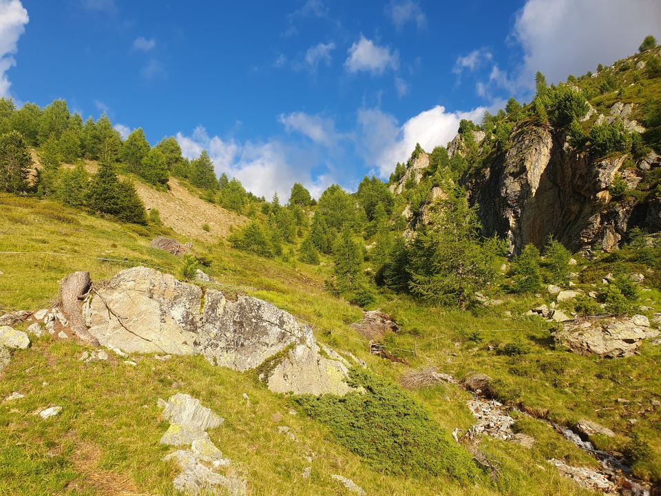 Danach kurz über ebenfalls einen alten ehemaligen Wanderweg zur nun privaten Hütte der neuen Besitzer abgestiegen und zu einem Arven- und Schafgarbe-Likör eingeladen worden, wodurch wir für den Abstieg nicht mehr laufen, sondern fast schon hinabschweben konnten... Was für eine schöne Aussicht dort oben. Nun verstehe ich, warum sie die Hütte übernommen haben....