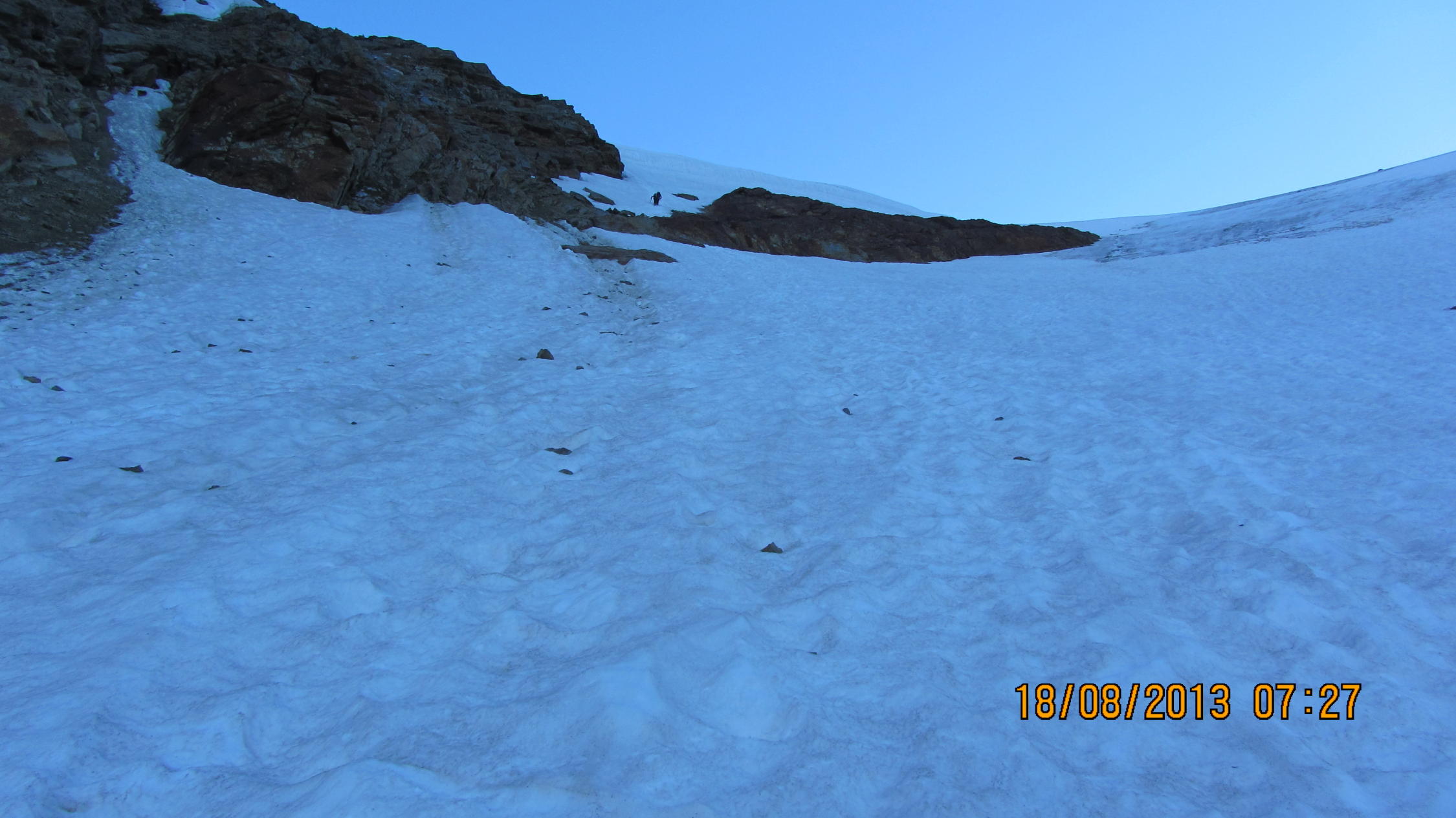 Es herrschten heute gute Verhältnisse. Auf dem Grübugletscher nur eine kurze heikle Passage mit einem steilen stück das ein bisschen vereist und ausgestzt ist sonst Schnee gut gefroren und griffig mit den Steigeisen.