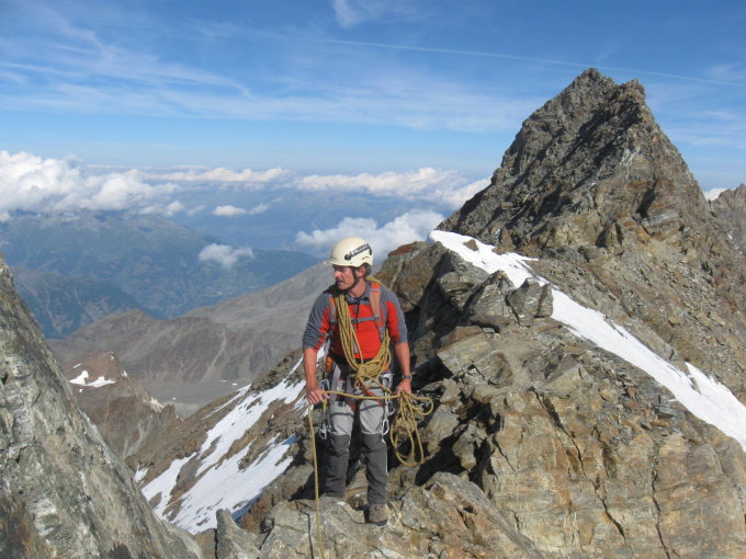 Ideale Verhältnisse am Grat, alles trocken. Für den Abstieg sind momentan ebenfalls keine Steigeisen nötig, da vom Gipfel bis zum Lagginghornletscher alles direkt im Fels (Schutt) abgestiegen werden kann.