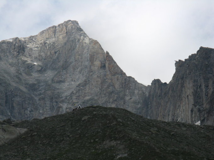 Unter der Abseilstelle ist der Bergschrund zum Sidelengletscher mittlerweile relativ groß. In der letzten Abseillänge früh genug schauen, wo der Abstand am geringsten ist und entsprechend (schräg) abseilen. Sonst geht's in den Schrund.