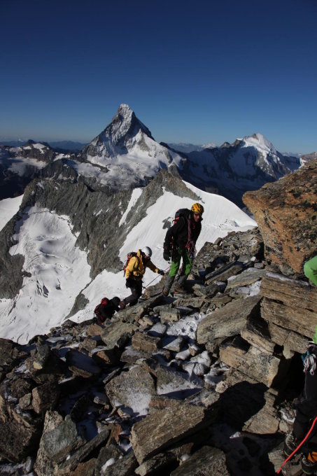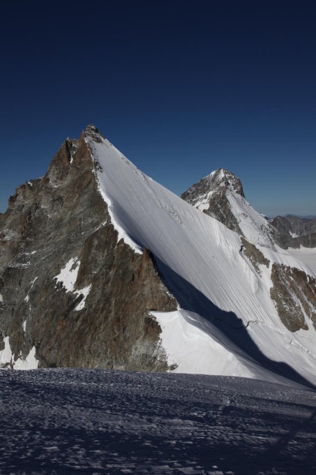 Eine Kaltfront vom Montag brachte etwas Neuschnee bis gegen 3000 Meter hinunter. Der Fels war leicht vereist, die Wellenkuppe konte aber ohne Steigeisen erklettert werden. Am ENE Grat dann deutlich mehr Schnee, aber eine ordentliche Spur im Firn. Praktisch kein Blankeis. Sind mit Steigeisen bis zum Gipfel geklettert