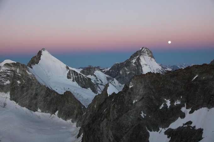 Tolle Verhältnisse am Zinalrothorn. Steigeisen wurden nur im mittleren Abschnitt benötigt. Der Anstieg zum Couloir und dessen Querung war beinahe Schneefrei. Auch die Binerplatte habe ich noch nie so trocken vorgefunden. Im oberen SW Grat sind noch einige Schneeflecken zu traversieren, ist aber gut machbar ohne Eisausrüstung.
