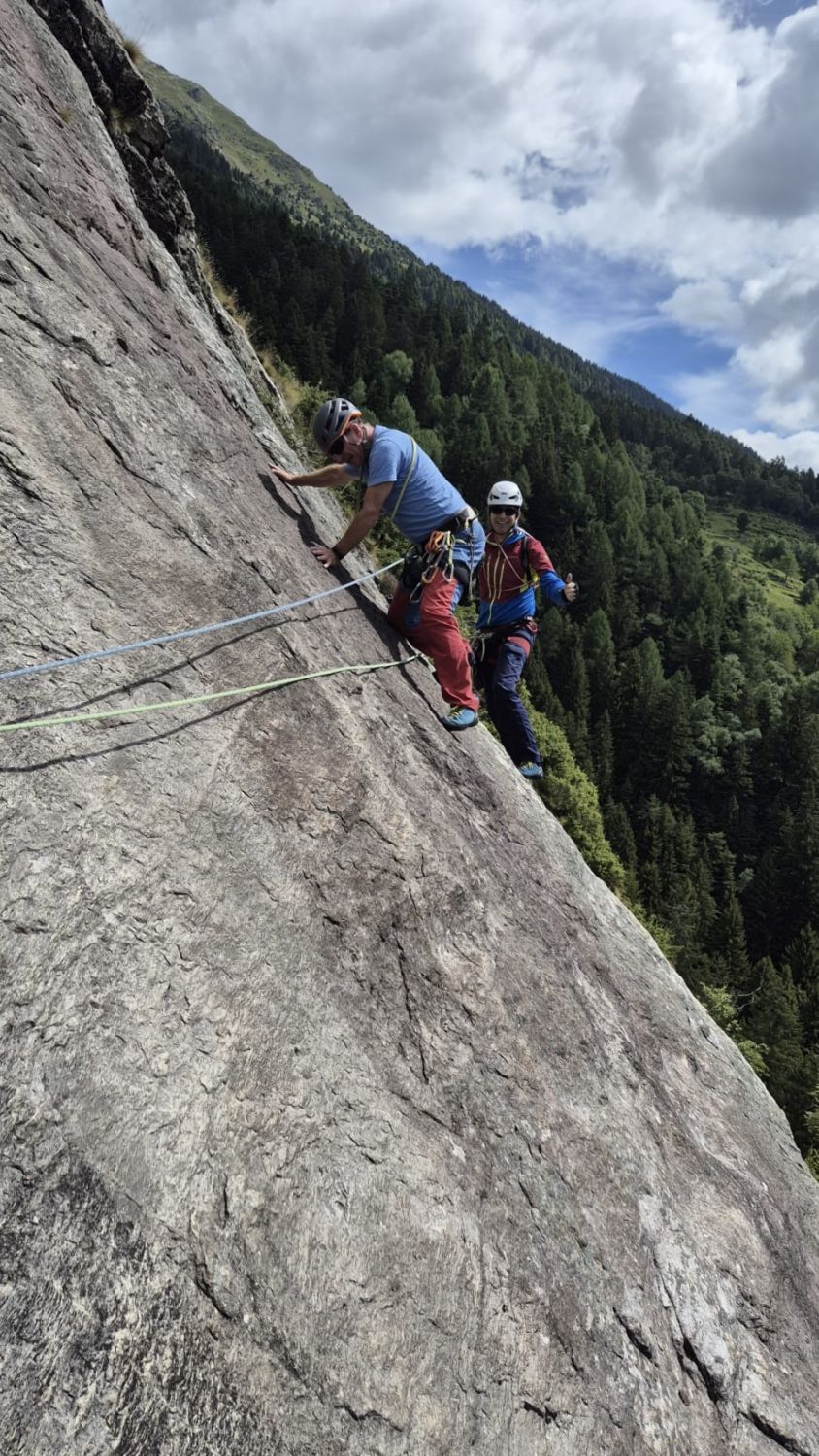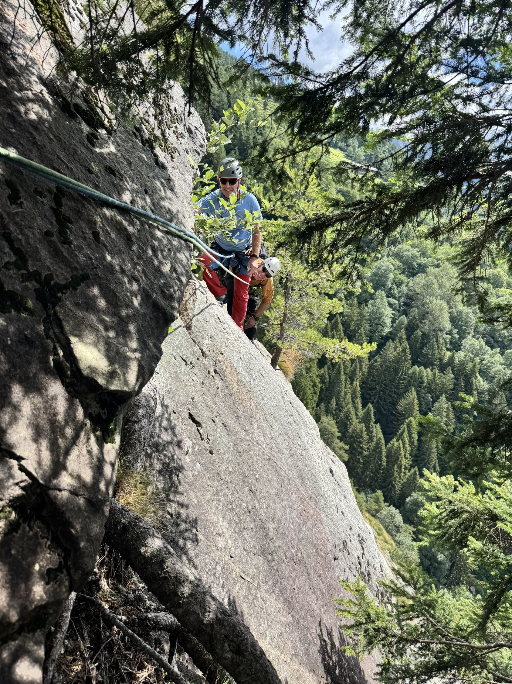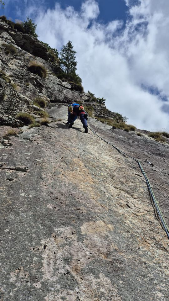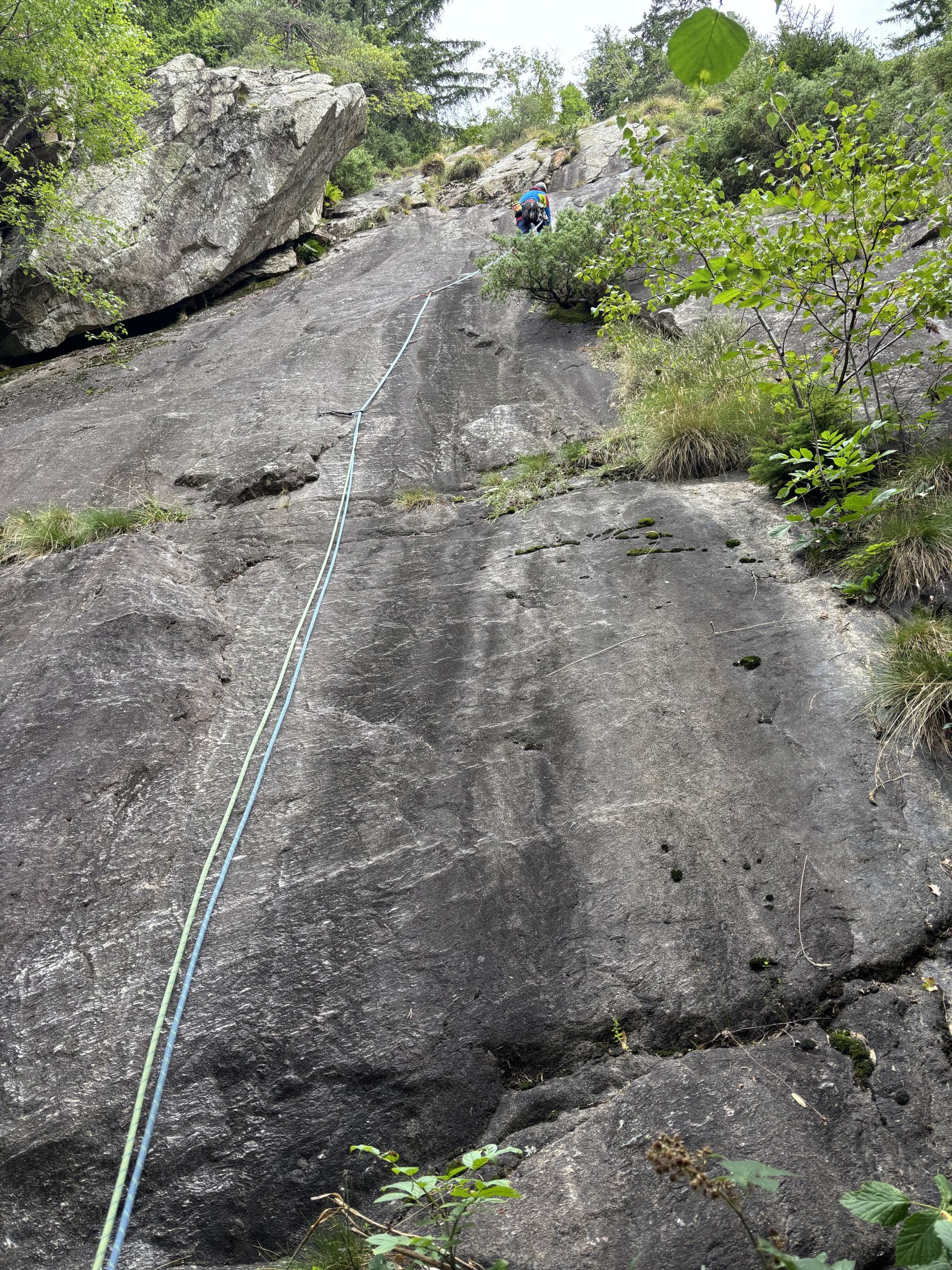 Wir wollten eigentlich etwas auf dem Gotthard klettern doch das Wetter hat nicht mitgespielt. Darum wieder einmal via del Veterano geklettert bis nachdem Quergang nach 15 SL - Genusstour mit 2 -3 Steilaufschwüngen welche in freier Kletterei bis 6a zu bewerten sind.