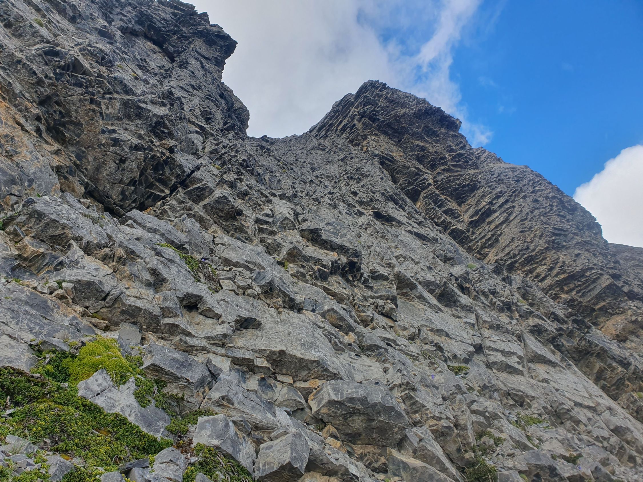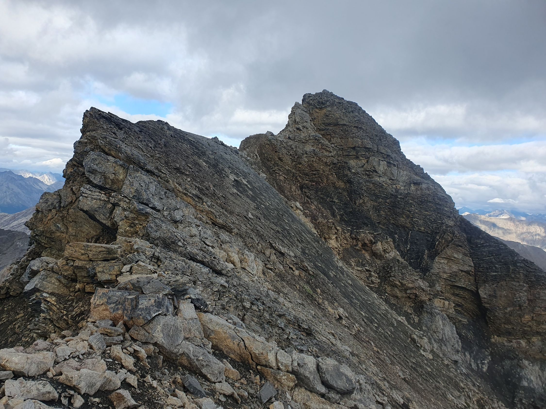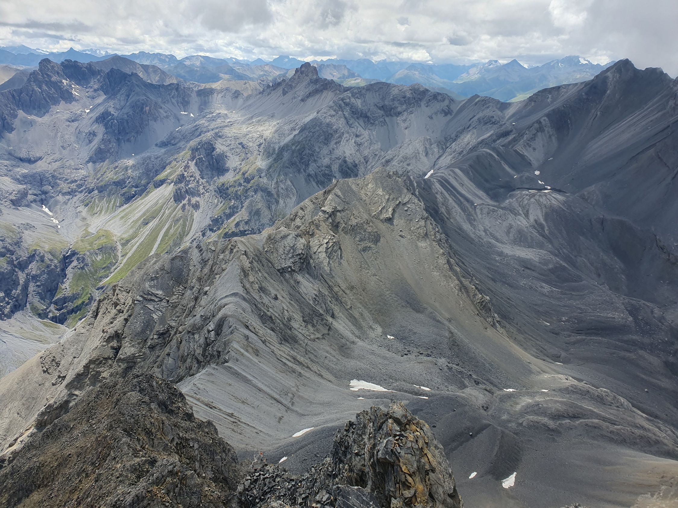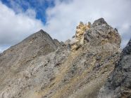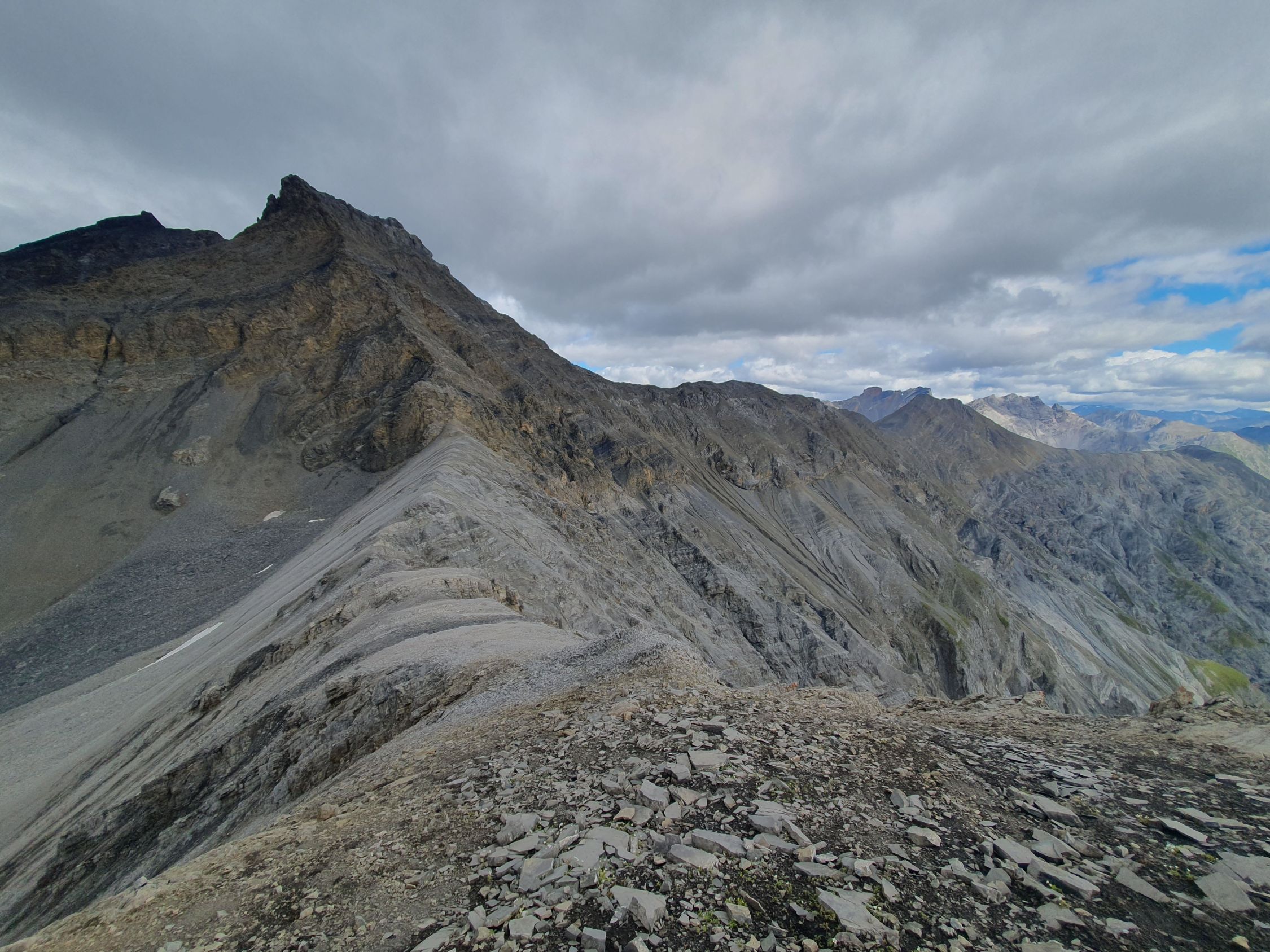 Ab P2829 ging es einfacher auf den Grat weiter bis abrupt ein Felsabschwung hinabgeklettert werden muss. Das stark brüchige und unstabile Gestein machte das Hinabklettern schwierig. Ich habe jede einzelne Platte prüfen müssen, bevor ich sie belasten konnte und die meisten hielten nicht (T6, II+). Nach dieser ersten Schlüsselstelle ging es danach zum Glück etwas einfacher im Gehgelände weiter zu P2917 (T4+, I+).