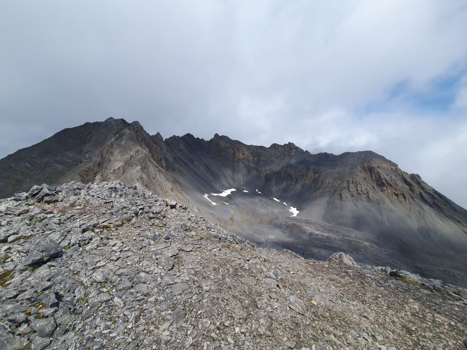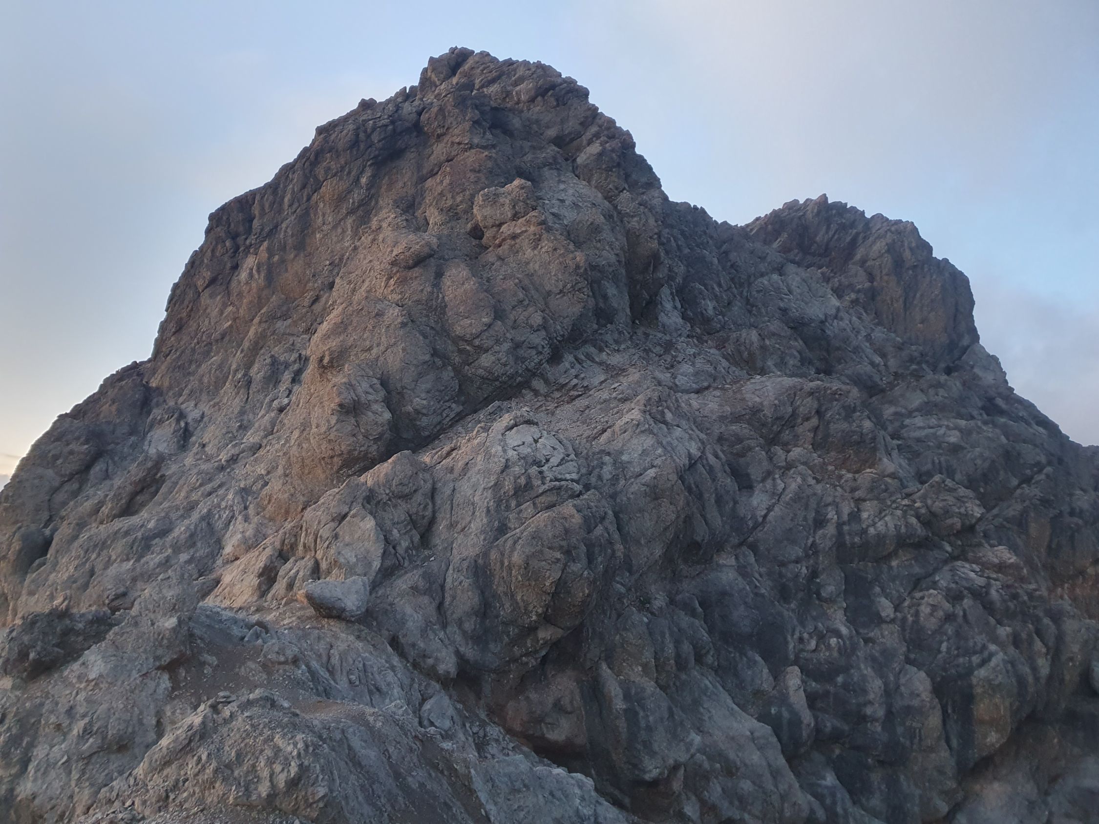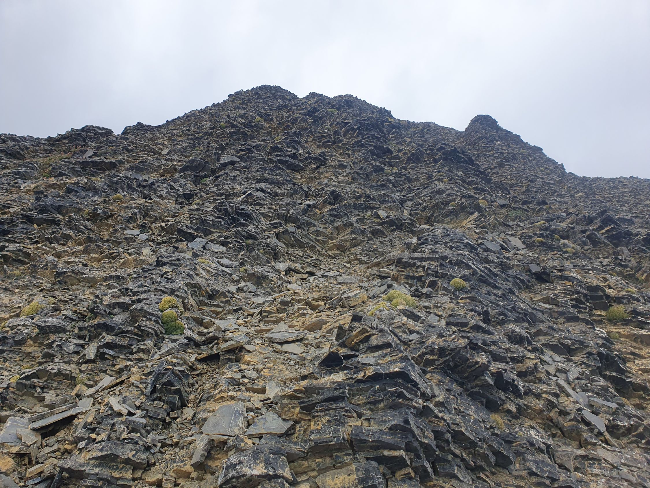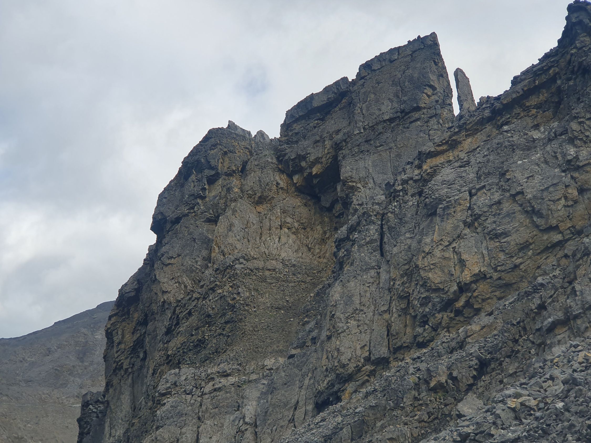 Ab P2829 ging es einfacher auf den Grat weiter bis abrupt ein Felsabschwung hinabgeklettert werden muss. Das stark brüchige und unstabile Gestein machte das Hinabklettern schwierig. Ich habe jede einzelne Platte prüfen müssen, bevor ich sie belasten konnte und die meisten hielten nicht (T6, II+). Nach dieser ersten Schlüsselstelle ging es danach zum Glück etwas einfacher im Gehgelände weiter zu P2917 (T4+, I+).