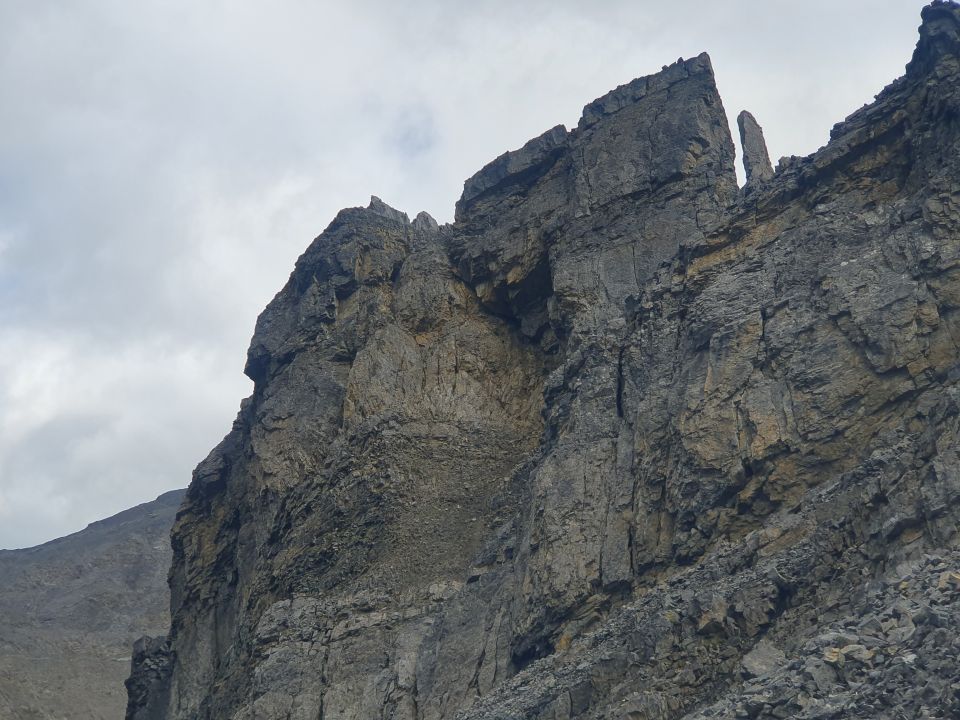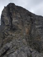 Diese dritte Schlüsselstelle war die ekligste (T6+, IV), die ich je hatte. Zum Glück lag auch da eine Schnur um den grossen stabilen Felsbrocken vor der Wand; falls ihr es wart, danke Norbert und Peter dafür, sonst danke demjenigen oder derjenigen, die es hinterlassen hat! Ich packte die soeben zuvor eingepackte Reep Schnur wieder aus und warf sie runter. Nun ja, bis zur Hälfte der Wand ging es gesichert, danach musste es halt ohne gehen. Warum habe ich damals nicht doch eine etwas längere Schnur gekauft gehabt… Nun nicht aufregen, Gedanken ausschalten und konzentrieren ist angesagt. Vorsichtig ging ich hier hinab bis zum Ende der Reep Schnur und konnte in der Mitte der Wand halt finden. Nun hiess es alles oder nichts, ich Sturkopf entschied mich für alles. Ich zog die Schnur ein, löste damit noch ein paar kleine Steine aus, die mein Dickschädel verdient hat, und fing an vorsichtig hinab zu klettern. Zum Glück hatte es unten etwas mehr Griffe als oben, so, dass ich erstaunlicherweise doch noch gut hinab kam. Bis anhin wohl meine anspruchsvollste Kletterei, die ich jedoch in diesem Schwierigkeitsgrad grundsätzlich nicht unbedingt brauche.