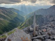 Nun war ich überzeugt, das Schwierigste bis zur Fuorcla dal Diavel gemeistert zu haben, doch schon gleich nach P2917 wurde ich eines Besseren belehrt. Kurz nach P2917 konnte ich die grössten Schwierigkeiten noch südlich umgehen, doch dann kam einen sehr steilen und ausgesetzten Abstieg von rund 7 Meter nach Süden (T6+, III), die zweite Schlüsselstelle. Hier habe ich ein Stück Seil um einen Blockstein für ein Abseilen gesichtet. Ich bin ziemlich überzeugt, dass dieser noch von Norbert Joos und Peter Gujan sein müssen, die im Jahr 2005 den Kanton Graubünden auf der 740km langen Grenzlinie in 77 Tage alle 335 Gipfel bestiegen. Norbert Joos ist im Jahr 2016 am Piz Bernina durch einen Mitrissunfall einer anderen Person am Spallagrat verunglückt. Wenn die beiden diese Grenzlinie von Ost nach West gegangen sind, dann zu 100%, falls nicht, dann muss sich hier oben sonst mal jemand verirrt sein… Hat hierzu vielleicht jemand das Buch «Grenztour Graubünden gelesen» und kann dazu etwas sagen?