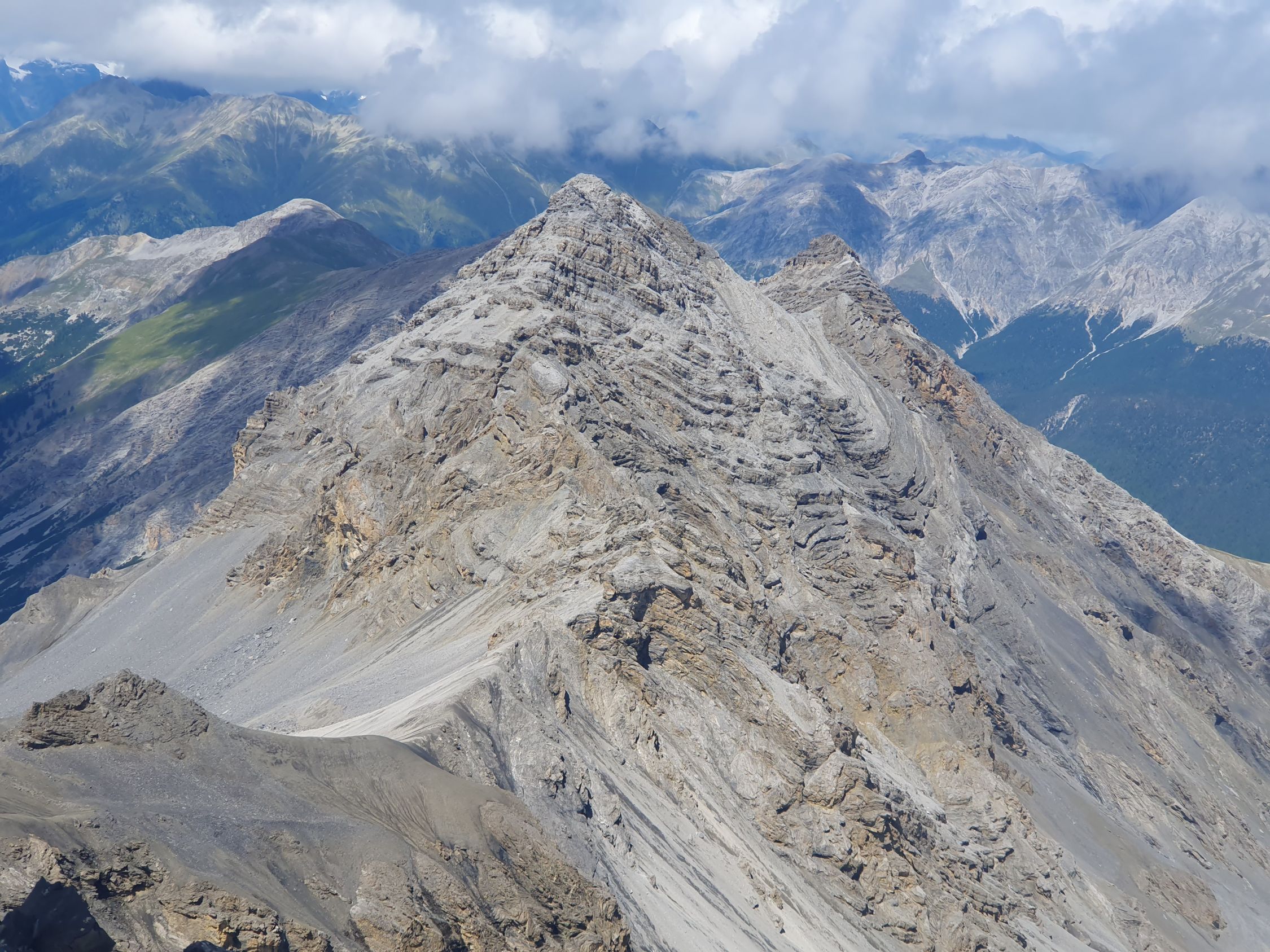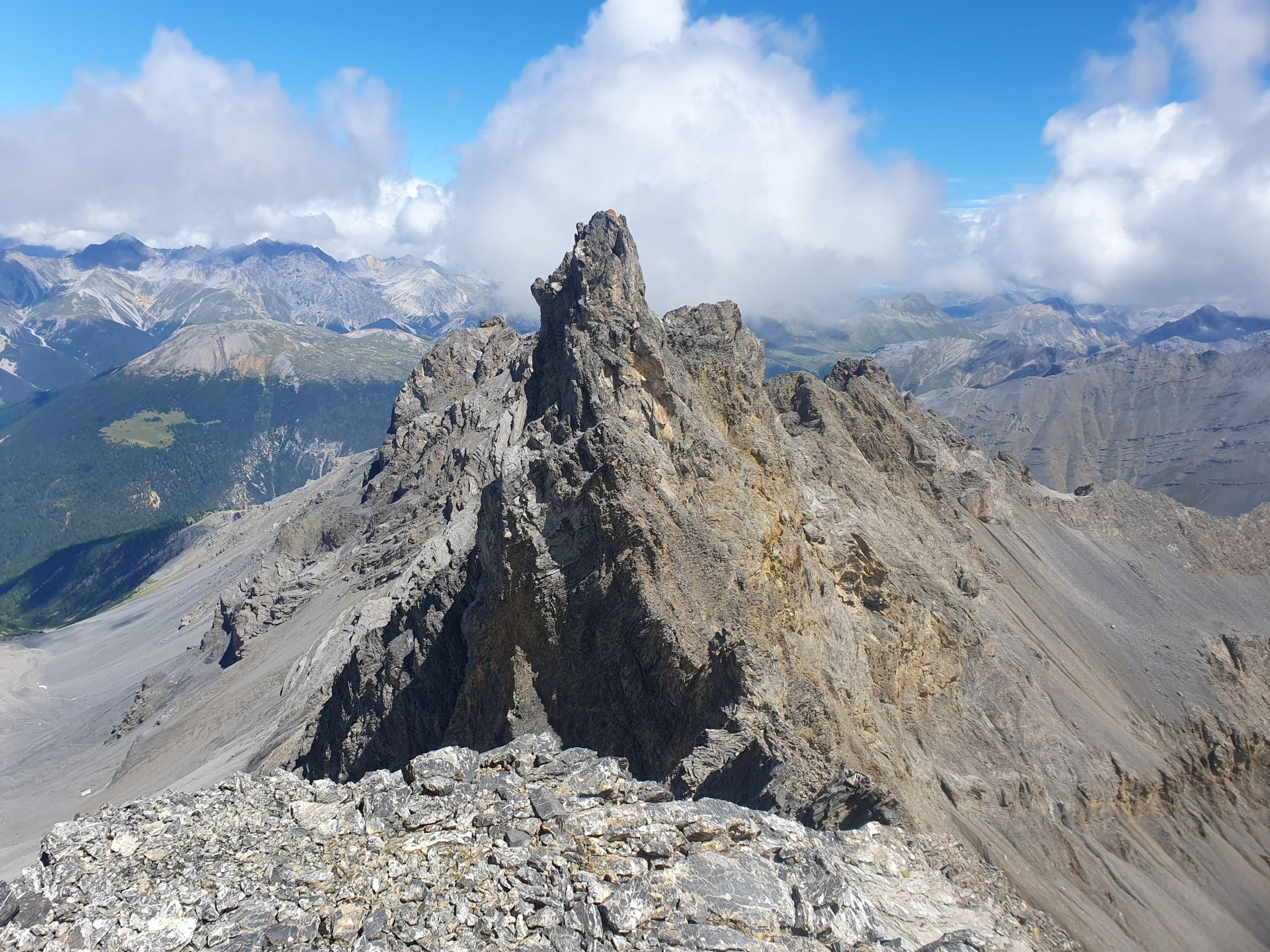 Auf dem Cima del Fopél tauchte der Piz da l’Acqua West- und Ostgipfel manchmal aus den Wolken aus, was ich als einen Wink wahrnahm. Ohne hier gross Pause zu machen (warum auch ohne grosse Sicht) bin ich 100 Hm den schuttigen Verbindungsgrat abgestiegen, um dann zuerst leicht, später etwas steiler über eine steile Rinne, die mit Ketten gesichert ist, die ich jedoch nicht gebraucht habe, hoch zum Grat der Landesgrenze hochzusteigen. Das Wetter besserte sich, so, dass ich mich genüsslich den SSW-Grat des Piz da l’Acqua E-Gipfel (P3118) in Angriff nahm. Nach vergangenen Reklamationen seitens Nationalparks zu meinen vergangenen Touren auf der Nationalparkgrenze, Drohungen zu Busse und Eintragslöschdrohungen in diesem Portal, habe ich mir heute grosse Mühe gegeben direkt auf den Grat zu bleiben, resp. nicht nach Westen auszuweichen, was mir zuerst auch sehr gut gelang. Nach dem ersten Aufschwung ist oben an der Wand auch ein kleiner Steinmann zu sehen, der einigermassen den Weg aufzeigt. Dieser erreicht man nur jedoch nur im rutschigen Kies auf Felsen, wohl der schwerste Part bis zum Piz da l’Acqua E-Gipfel. Danach wird der helle Blockturm westlich im Schutt umgangen und der letzte Gipfelaufstieg erfolgt dann ziemlich direkt auf dem Grat bis zum Gipfel mit kleinem Steinmann. Was für eine Aussicht! Nach Osten ist die Gestalt des Hauptgipfels des Piz da l’Acqua furchteinflössend und faszinierend zugleich! Nach Norden ist der Piz dal Diavel, wie sein Name schon sagt «Gipfel des Teufels» seinen Namen würdig: Wilder geht’s kaum! Nur liegt der leider oder gerade deswegen im Nationalpark. Hier lohnte es sich eine längere Pause einzuleben, zumal auch das Wetter immer freundlicher wird. Der Piz da l’Acqua W-Gipfel liegt zwar nur wenige Meter daneben, doch ein Spalt mit einer grossen schrägen Platte und der Turm an und für sich sah für mich für eine direkte Besteigung zu anspruchsvoll aus. Hierfür habe ich beim Aufstieg einen anderen Plan geschmiedet, mal schauen, ob dies klappen könnte…