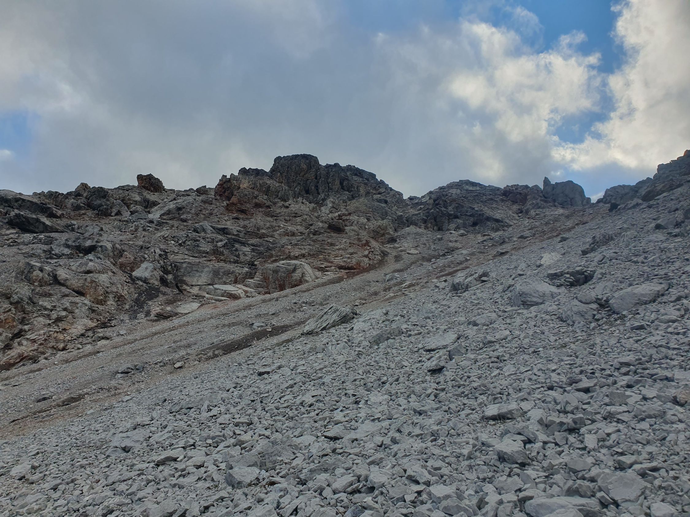 Nach einer halben Stunde Pause ging es wieder zurück zu der Stelle, wo der Weg vom Cima del Fopél herkam und danach unschwierig zu P3076. Der weitere Abstieg zu P2829 war stark abschüssig und nicht einsehbar, somit musste ich jederzeit mit einem Rückzug rechnen. Ich stieg von P3076 gefühlt in stark abschüssigem Gelände mit kleinen bröseligen plattigen Steinen wie eine Schnecke hinab. Alles bewegte sich und nichts hielt, so ging ich manchmal mit allen Vieren langsam wie ein umgedrehtes Tier hinab zu P2829 stets in der Hoffnung, dass eins der vier Extremitäten halten würde. Zudem ist meine GPS-Aufnahme dabei eingeschlafen und habe es erst bei P2829 bemerkt und es wieder eingeschaltet.