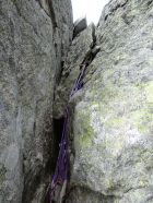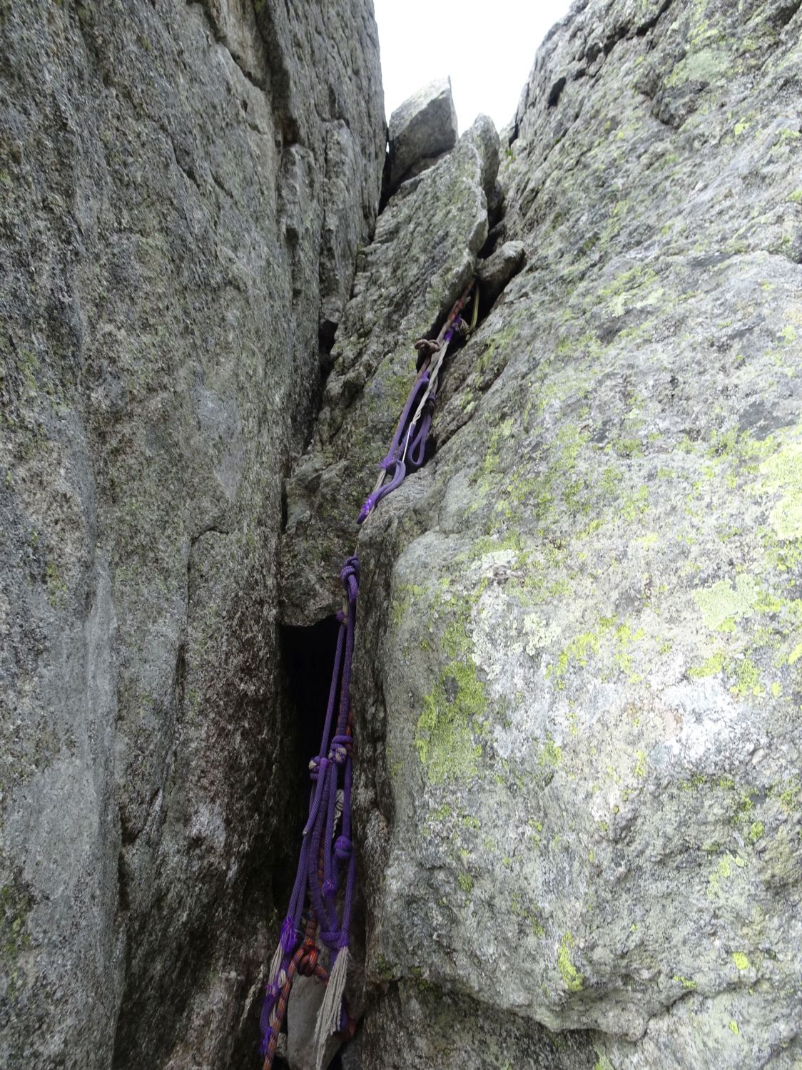 Wir sind um 5:45 an der Hütte los und waren um 6:45 am Einstieg. Ein alter Seilstrang hilft im Kamin zum Metallkreuz über die ersten 2 m hoch. Sieht nicht sehr zuverlässig aus, hat aber gehalten. Danach sind wir alles seilfrei geklettert. Wem das Gelände liegt - ein Vergnügen! Wir waren bereits um 8:00 am Gipfel. Leider eingeschränkte Sicht nach Norden wegen Wolkenbank. Abstieg dann auch seilfrei bis auf 2x abseilen (uns hat ein 40 m Seil gereicht). Es gibt mehrere Abseilmöglichkeiten, aber eben oft auch abkletterbar wenn man sich in dem Schwierigkeitsgrad wohlfühlt.