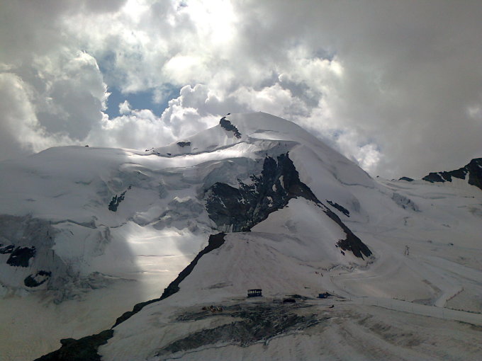 Tour gestern aufs Breithorn half offensichtlich zur Akklimatisation. Glaubte der einzige zu sein der (10:25 Uhr) noch nach oben steigt und zögerte deshalb eine Weile bei der kleinen Schneebrücke. Zeitweise geriet ich in Wolken.