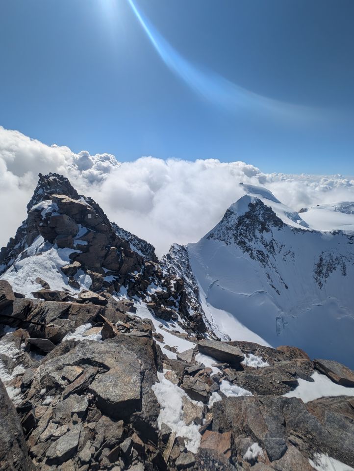 Very good conditions on the ridge down from zumsteinspitze no ice just snown with a light cover of the rocks down from the summit. The way up to the grenzgipfel was in good condition aswell clear track through the snow were the rocks were free from ice.