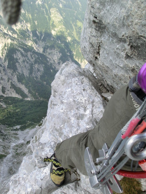 Fels ist meistens sehr kompakt und griffig; durchwegs gute Griffe und Tritte; das Schwierigste ist die Routenfindung, zunächst muss man die richtige Einstiegsrinne finden (Haken) und kurz vor dem Grat rechts bleiben und nicht (wie wir) links in den Kamin mit dem Klemmblock; das Kriechband ist sehr ausgesetzt und die luftigste Passage, rechts daneben geht es überhängend mehrere 100Meter nach unten, war aber auf dem Bauch kriechend gut machbar;