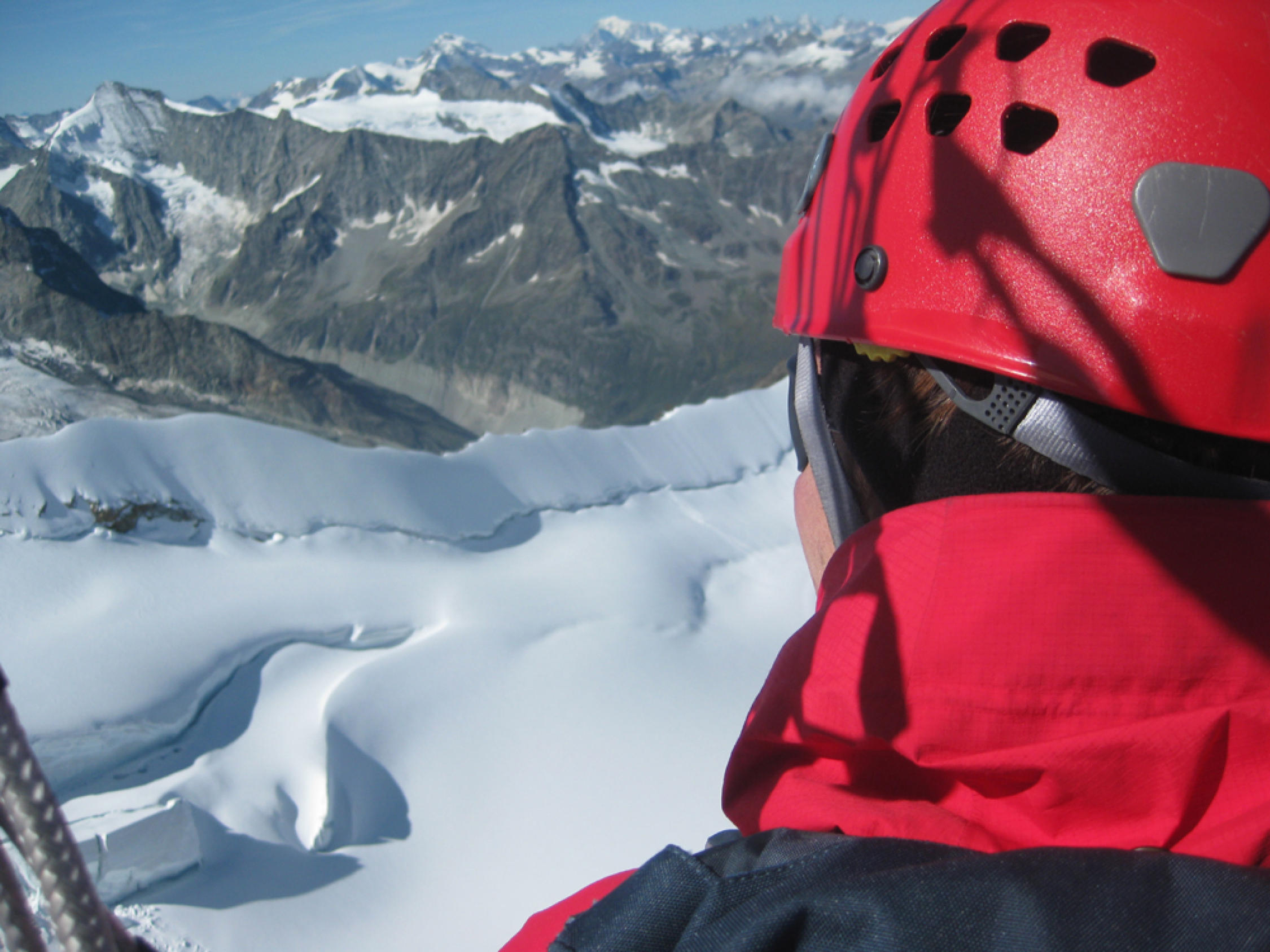 Wir sind direkt von Zinal aufgestiegen (5.5 h). Zweiter Kaffe in der neuen Hütte mit den tollen Panoramfenstern. Genussvoller Flug hinunter nach Zinal.