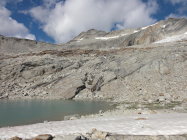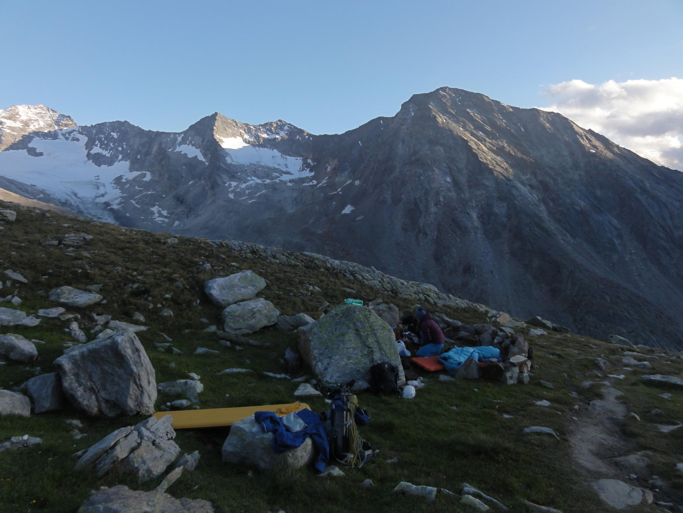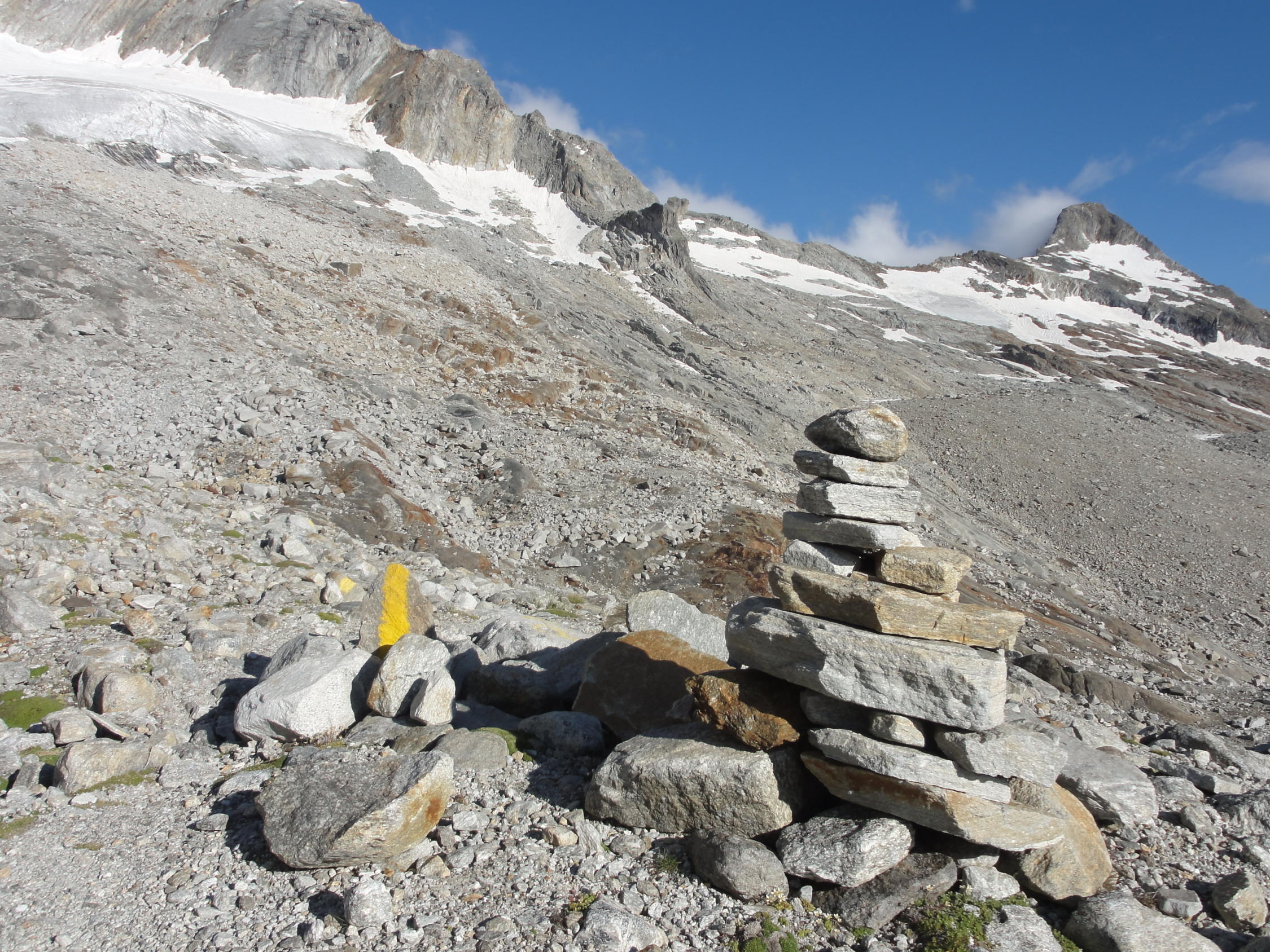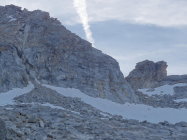 Zustieg zum Einstieg: Einfach zu finden, alles trocken. Die Überbleibsel des Gletschers sind noch mit Schnee bedeckt. Am Morgen früh teils recht hart und unangenehm.