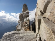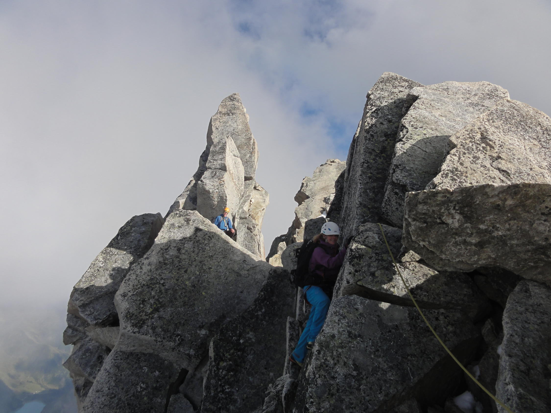 Um zu Zeit zu sparen, ist es von Vorteil die weniger schwierigeren Passagen am gestreckten Seil zu klettern. Kletterei bis Gipfel folgt nach logischer Linie. Dort wo man besser in die Westflanke quert, hat es Steinmännchen. Nur wenige Bohrhaken auf der ganzen Route.
