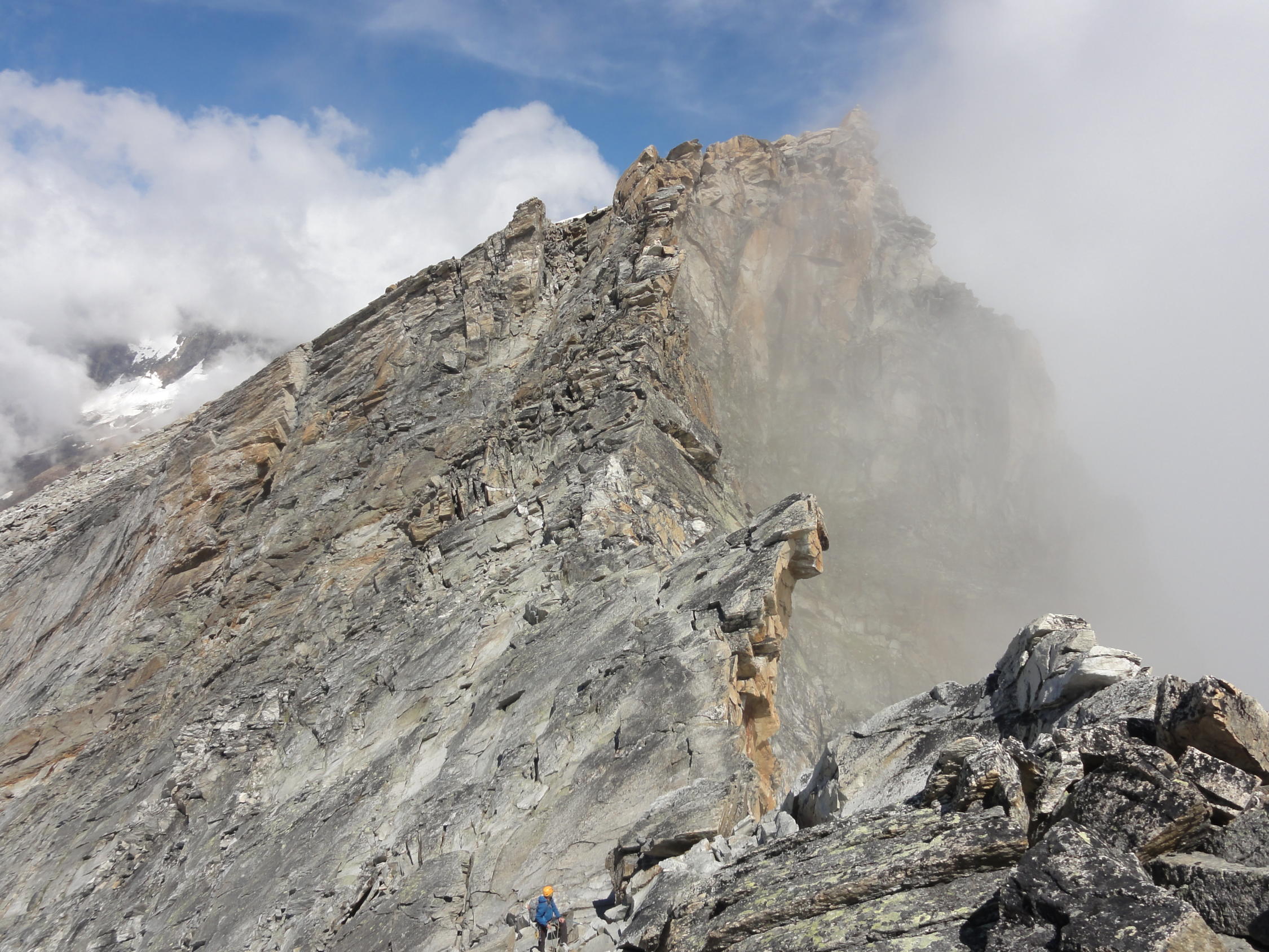 Grat bis Gipfel: Alles trocken, kein Schnee oder Eis im Felsteil. Die kurze Firnpassage besteht aus weichen Trittschnee.