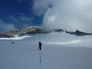 Gletscher hat 10-20 cm Firnauflage, leicht harschig, aber nicht tragend. Spaltentechnisch etwas tückisch (im unteren Teil einige Löcher im Spurbereich). Bergschrund unterhalb der Oberschrammachscharte und Randkluft am Südgrat unproblematisch.