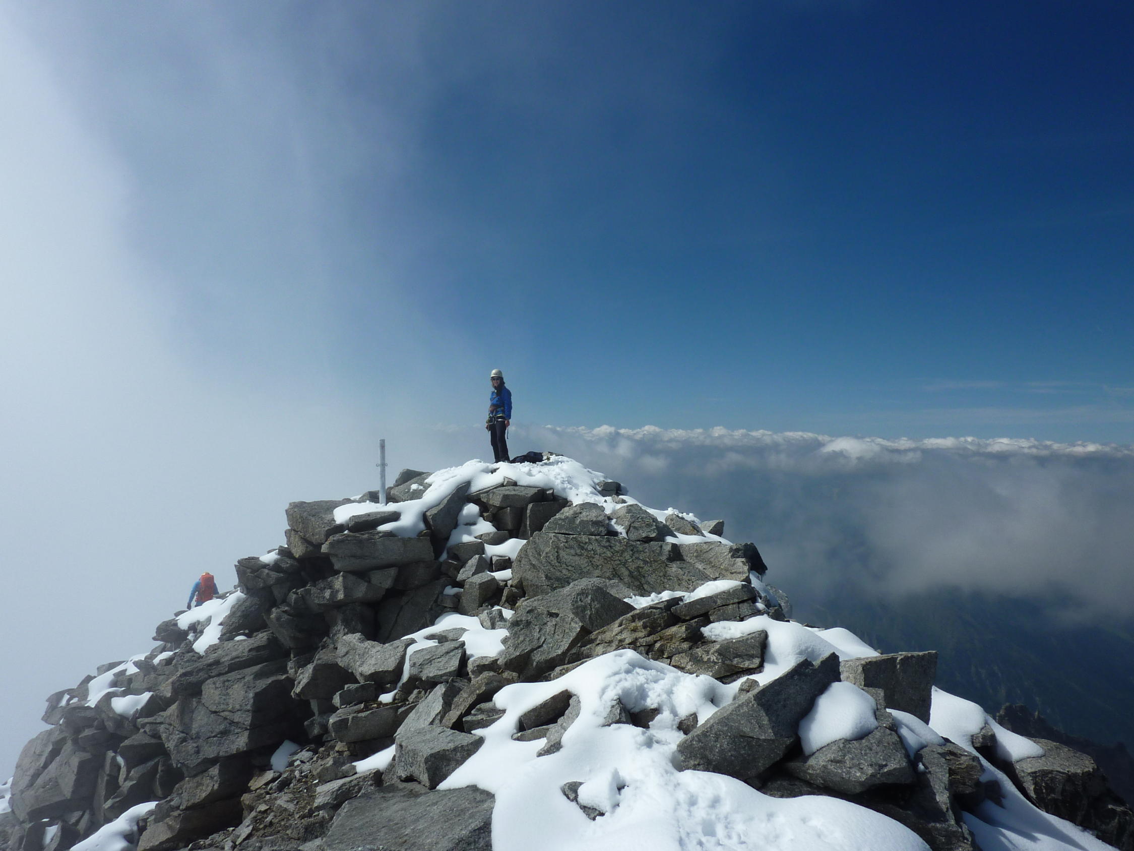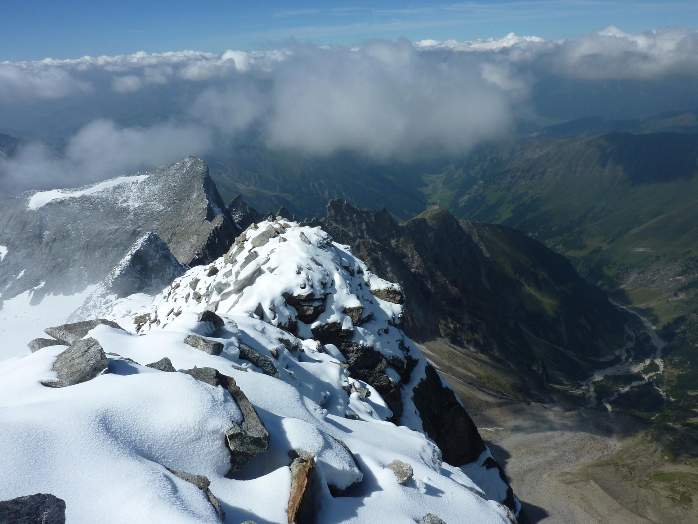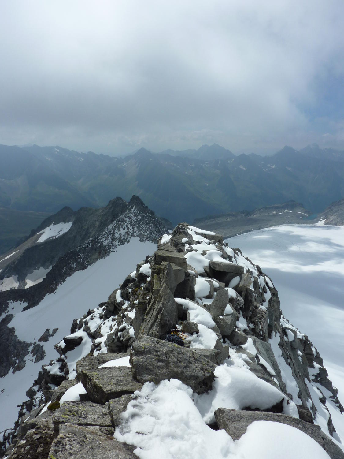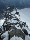 Oberhalb von etwa 3.000 m relativ viel Neuschnee, Gratbegehung dadurch etwas anspruchsvoller als in aperem Zustand. Die Schlüsselstelle (Wändle kurz vor dem Gipfel, Reepschnur derzeit im Schnee) lässt sich auch ostseitig umgehen.