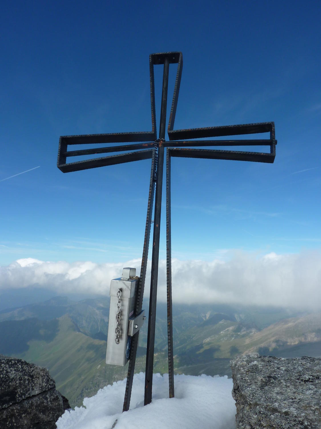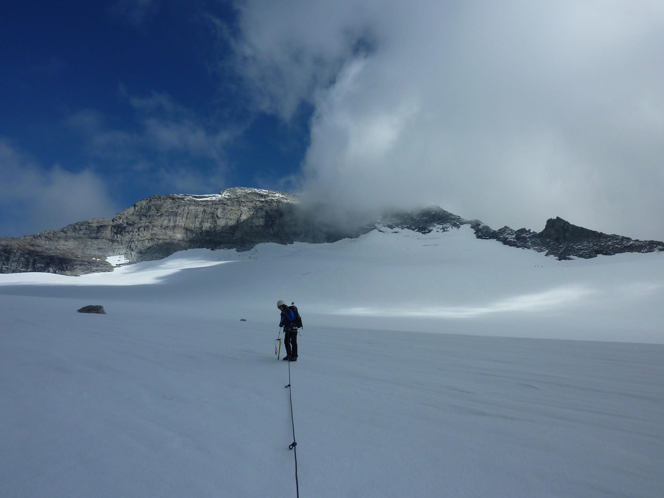 Der Südgrat sollte langsam wieder ausapern, ist aber bei gesetztem Schnee sicher auch gut mit Steigeisen begehbar. Gletscher wirkt harmloser als er ist, Seil ist durchaus angebracht.