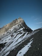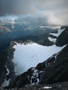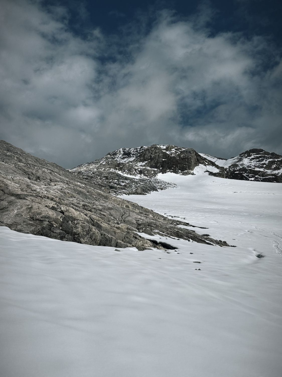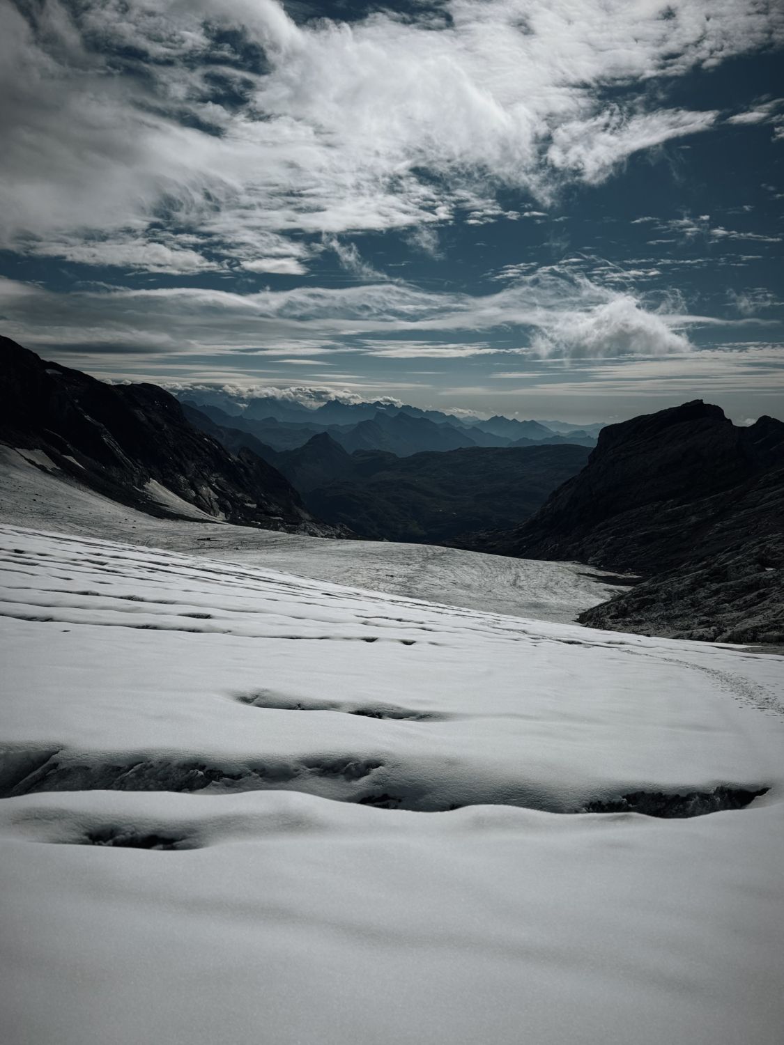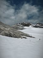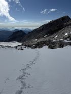 Gletscher bis 2550m aper, auf 2680m eine größere Spalte die Vorsicht verlangt. Auf dem oberen Gletscher etwa 15 - 20 cm Neuschnee, Spur auf den Felsen. Felsstufe und schwadergrat mit wenig Schnee und problemlos.