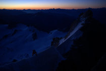 Couloir: Bergschrund lässt sich einfach überwinden. Danach nach rechts in sandiges, einfacheres Gelände. Im oberen Teil sehr hartes Eis, geht fast einfacher im Fels (Achtung vor Steinschlag für nachfolgende Seilschaften!). Das Couloir lässt sich gut im Dunkeln mit Stirnlampe klettern.