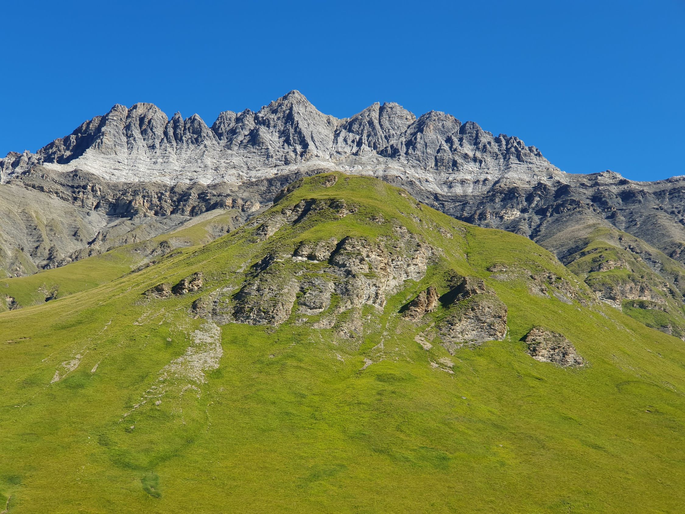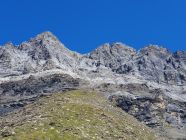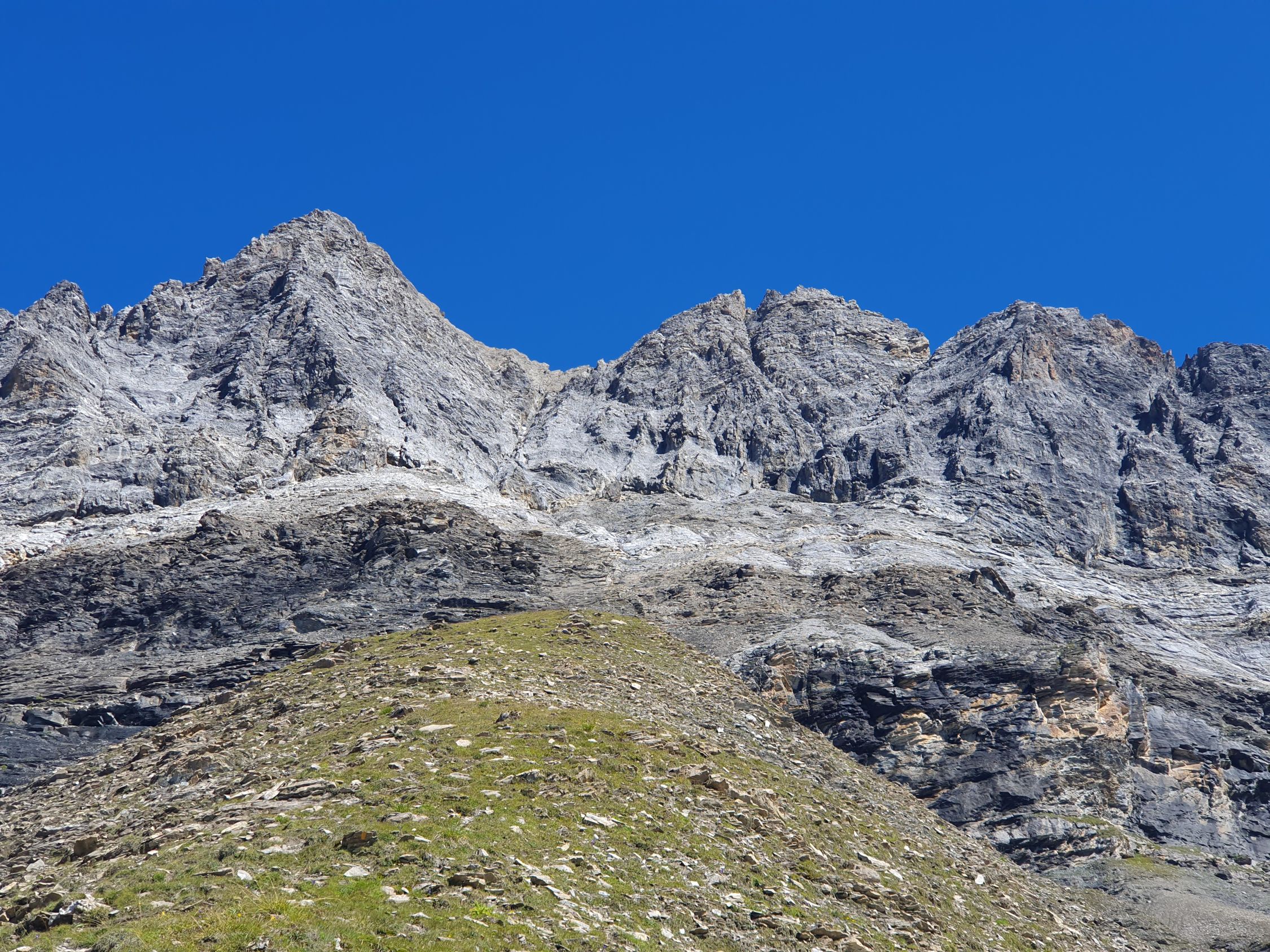 Insgesamt verbringe ich auf diesen beiden Zacken eine ganze Stunde. Sie beide bieten genug Platz für einen längeren Aufenthalt. Ob ein Abstieg auf dem W-Grat machbar wäre geistert in meinem Kopf? Aber heute gehe ich kein Risiko ein. Auch deswegen habe ich keine Schnur mitgenommen. Ungern packe ich meine Sachen im Rucksack ein und steige ähnlich so ab, wie ich aufgestiegen bin, ausser, dass ich das obere Teil etwas tiefer traversiert habe und später nach dem Hauptcouloir unten, also nach der Barriere, eher westlich direkt auf knieschonendem schwarzem sandigem Kies statt östlich-ausholend über den brüchigen Schutt hinabgestiegen bin. Nach dem Schuhwechsel geht’s dann auf der Wiese deutlich schneller hinab, ausser, dass ich rechts mit einem Fuss in einem Murmeltierloch gelandet bin und mein Knie dies ziemlich stark abfangen musste…