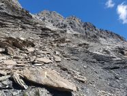 Zuoberst bei der Wiesengrenze, wo es nur noch Alpen-Kratzdisteln hatte, und ich mich dadurch schon viel schlauer fühlte, erlangt man den sog. Frühstücksplatz bei P2812. Ich habe jedoch mein kleines Frühstück mit Schuhwechsel weiter oben bei ca. 2880 gemacht, wobei man bei diesen letzten 70 Hm sich doch noch in stark rutschigem und nassem Schiefer hochkämpfen muss. Nach einem kalten Kaffee, der zum Frühstück dazu gehört, und den fälligen Schuhwechsel eröffnet bei ca. 2880 Hm ein breiter Band, der sich nach Osten zieht, Welt der Piz Tschütta.