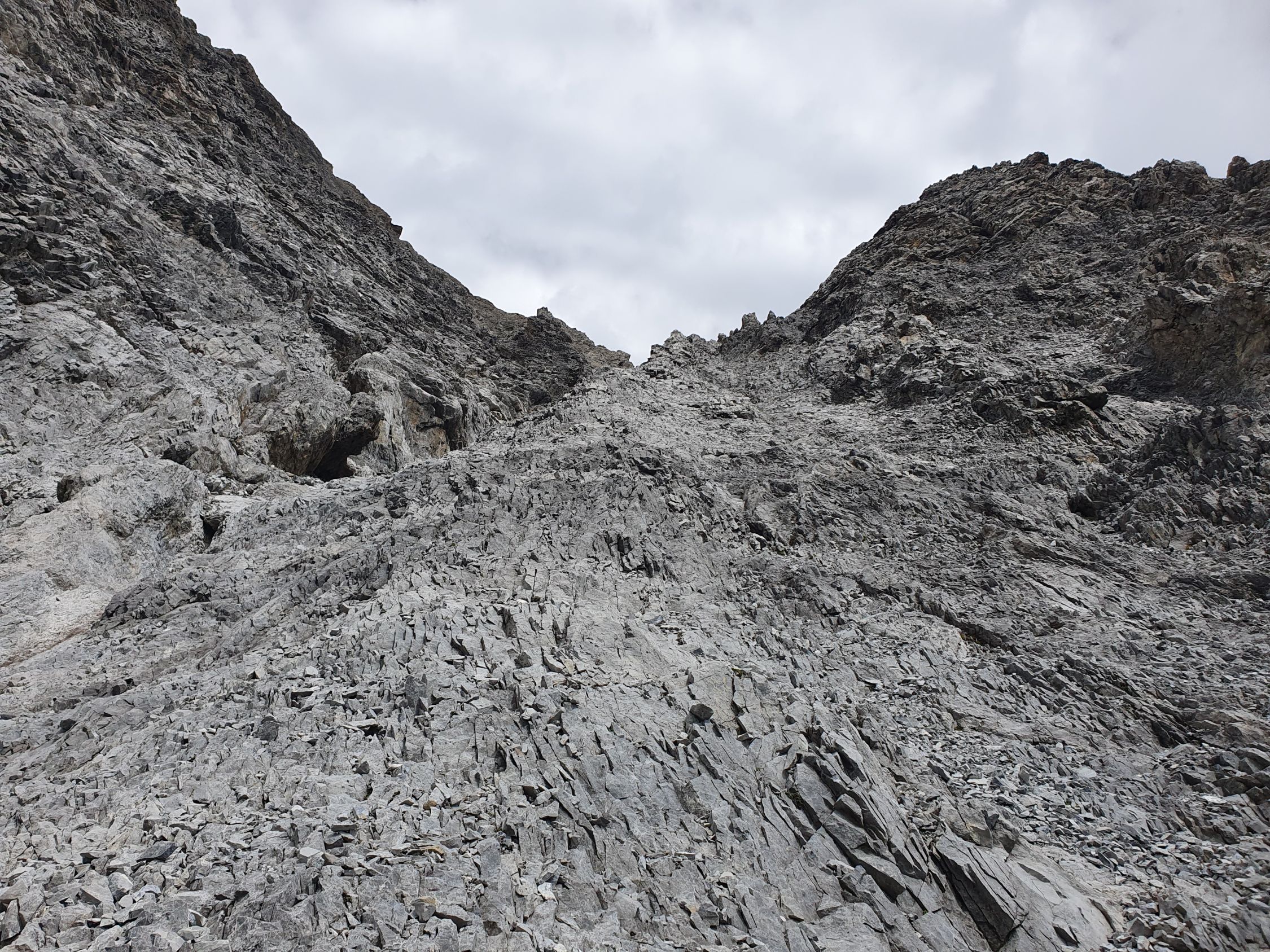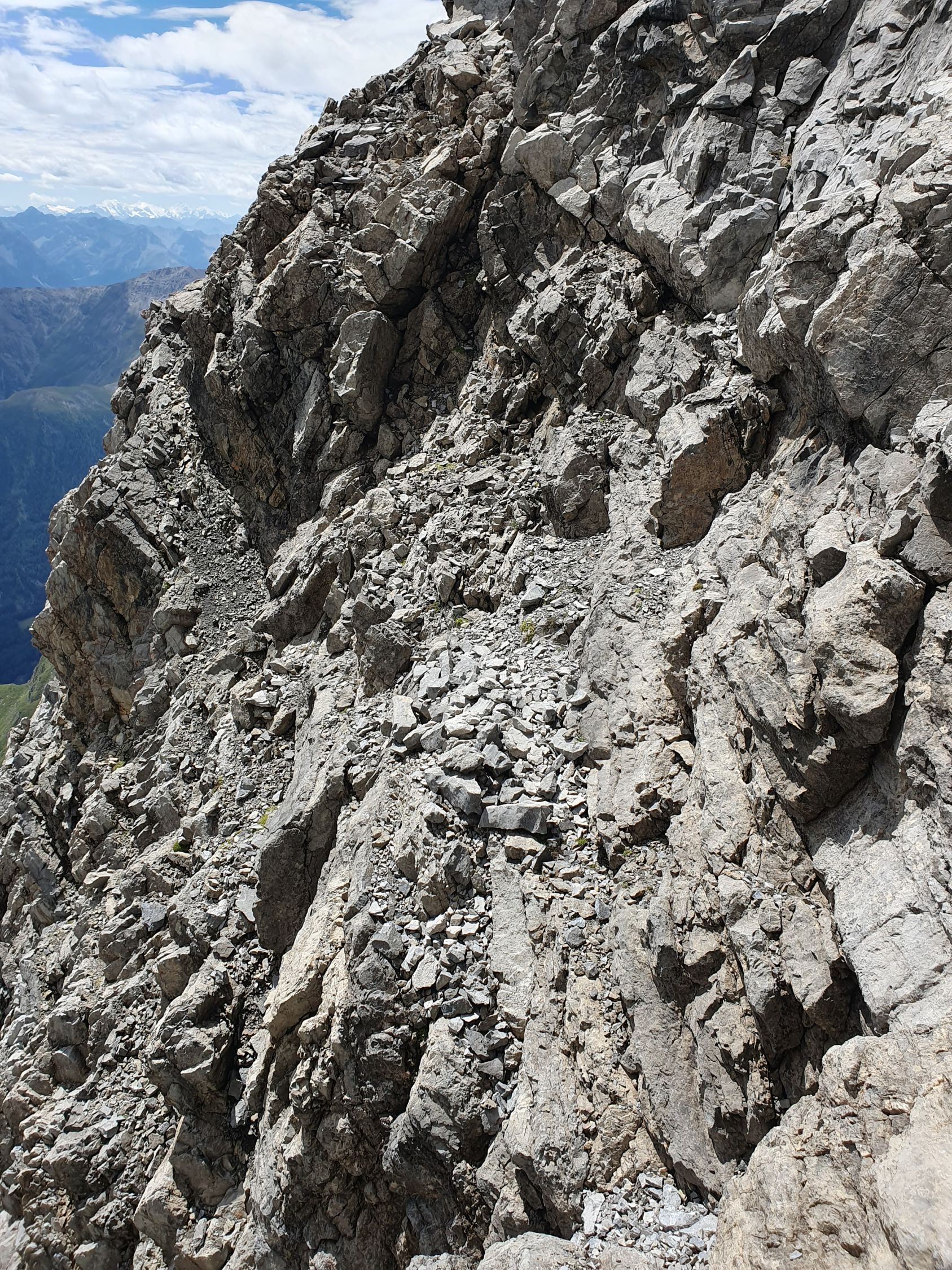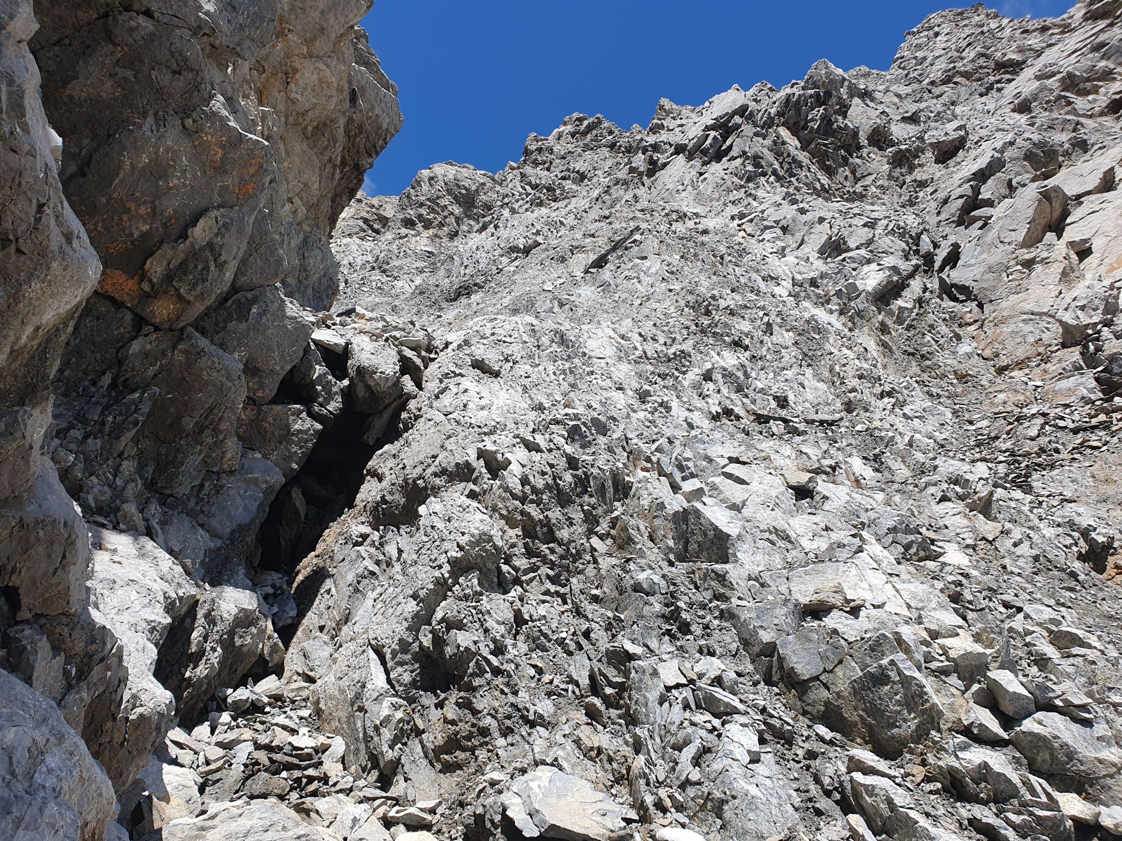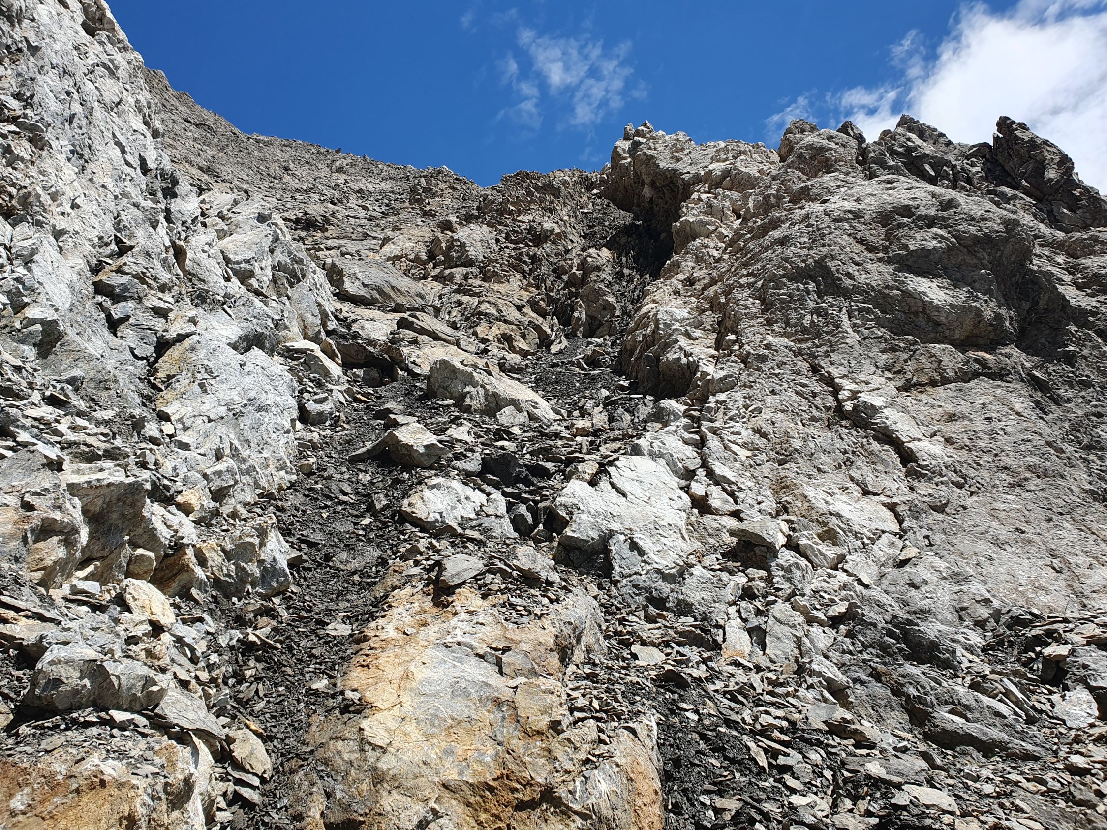 Nach diesem Band überquert man die Hauptrinne, die sich zwischen dem West- und Mittelgipfel hinabzieht, und kommt so in einem mässig steilem und offenem Schuttparadies, wo man im Gehgelände oder manchmal mit allen Vieren relativ einfach hoch kämpfen kann (T4, I). Oben erreicht man wieder eher in westlicher Richtung, aber noch östlich von der Hauptrinne und sehr nahe an diese eine Art Barriere, über die man kurz 5 Meter über glatte Tritte, die mit etwas Kies beladen waren, und die nun von mir poliert wurden, hochkraxeln muss (T5, II). Nun geht’s über schuttartige Felsstufen mit vielen losen Steinen immer etwas steiler hoch. Da ab 12:00 Uhr Wolken prognostiziert wurde, kam mir so der Aufstieg zu langsam vor. Deswegen habe ich ziemlich bald nach dieser Barriere die Entscheidung getroffen mein Aufstieg in der Hauptrinne weiter hochzukraxeln. Sie ist voller Geröll und Schutt, aber ich kam hier trotzdem schneller voran als vorhin an den östlichen Felsen, wo die Steine immer geprüft werden mussten. Das Hauptcouloir wies heute zwei kleine Schneefelder auf, die jedoch westlich nahe am warmen Felsen für einen Durchschlupf aper waren und den Aufstieg somit gerade noch nicht hinderte. Das Hauptcouloir war an zwei Stellen durch grosse, aber unstabile Steine, kurz unterbrochen. Hier wäre es nicht ratsam an einem solchen blockierten Steinbrocken, der hintendran mit unzähligem Geröll beladen ist, direkt hochzuklettern. Bei der kleinsten Belastung kommt nicht nur der Brocken, sondern auch noch das Geröll entgegen… Das habe ich beim Aufstieg in der S-Rinne des Piz Tavrü gelernt gehabt. Diese beiden Stellen können kurz östlich einfach durch kraxeln umgangen werden. Nun bekommt das Hauptcouloir einen leichten Knick nach Osten, da, wo die Felsen bräunlich sind. Hier weiter hochsteigen (max. T5, I+) bis das Gelände steil und stark rutschig wird. Nun verlässt man die braunen Felsen nach Osten und traversiert dieses steil über weissgefärbte und unstabile Steine nach Osten bis zu einem Abgrund, der eigentlich die Rinne zwischen dem Mittel- und Hauptgipfel ist. Nun kurz davor auf den kleinen «S-Grat» relativ einfach und direkt hoch zuerst über loses Schutt und später über feste Blöcke zum Mittelgipfel (T4+, I+). Diesen habe ich von Süden her direkt erreicht, resp. ohne den W-Grat berührt zu haben.