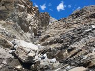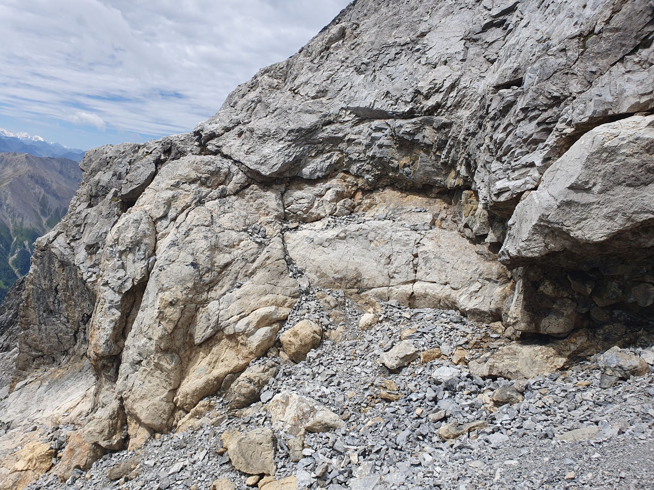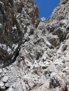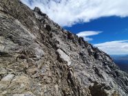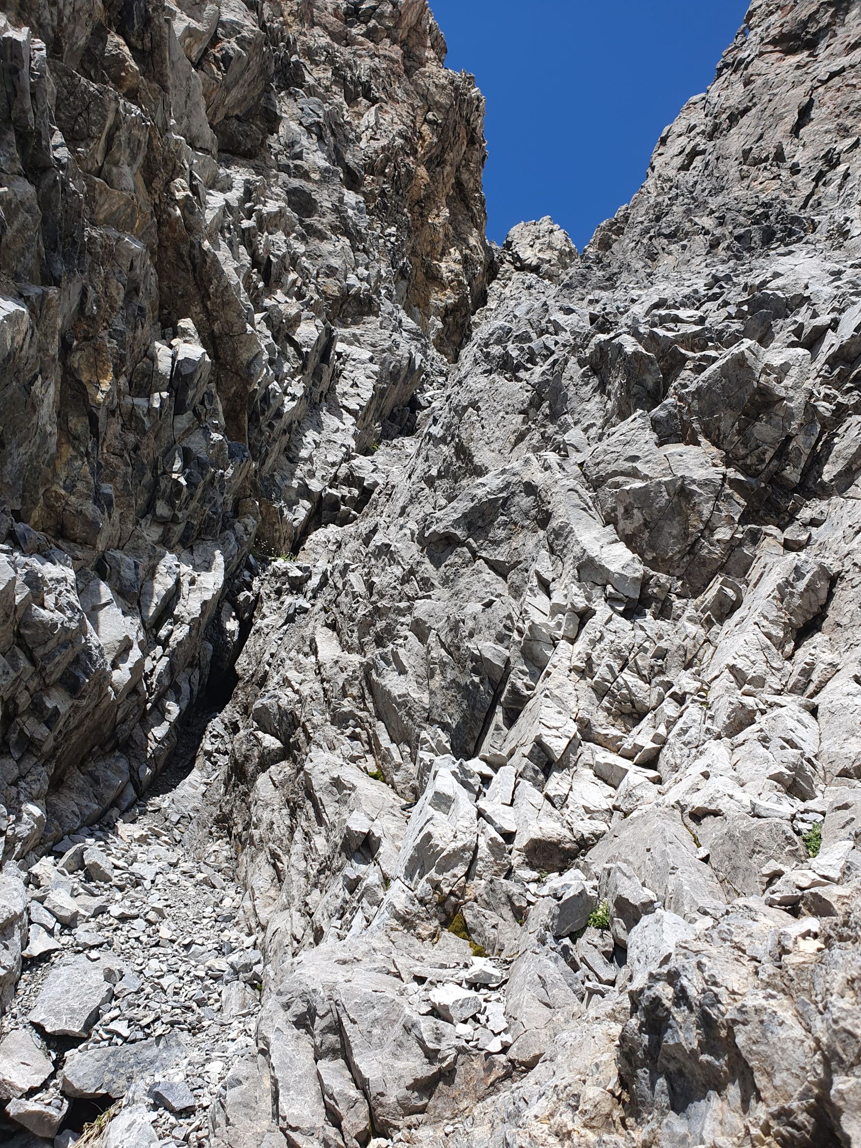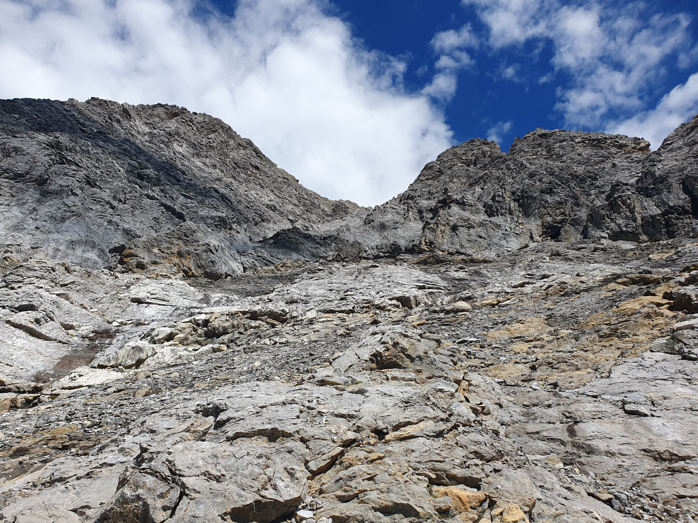 Nach diesem Band überquert man die Hauptrinne, die sich zwischen dem West- und Mittelgipfel hinabzieht, und kommt so in einem mässig steilem und offenem Schuttparadies, wo man im Gehgelände oder manchmal mit allen Vieren relativ einfach hoch kämpfen kann (T4, I). Oben erreicht man wieder eher in westlicher Richtung, aber noch östlich von der Hauptrinne und sehr nahe an diese eine Art Barriere, über die man kurz 5 Meter über glatte Tritte, die mit etwas Kies beladen waren, und die nun von mir poliert wurden, hochkraxeln muss (T5, II). Nun geht’s über schuttartige Felsstufen mit vielen losen Steinen immer etwas steiler hoch. Da ab 12:00 Uhr Wolken prognostiziert wurde, kam mir so der Aufstieg zu langsam vor. Deswegen habe ich ziemlich bald nach dieser Barriere die Entscheidung getroffen mein Aufstieg in der Hauptrinne weiter hochzukraxeln. Sie ist voller Geröll und Schutt, aber ich kam hier trotzdem schneller voran als vorhin an den östlichen Felsen, wo die Steine immer geprüft werden mussten. Das Hauptcouloir wies heute zwei kleine Schneefelder auf, die jedoch westlich nahe am warmen Felsen für einen Durchschlupf aper waren und den Aufstieg somit gerade noch nicht hinderte. Das Hauptcouloir war an zwei Stellen durch grosse, aber unstabile Steine, kurz unterbrochen. Hier wäre es nicht ratsam an einem solchen blockierten Steinbrocken, der hintendran mit unzähligem Geröll beladen ist, direkt hochzuklettern. Bei der kleinsten Belastung kommt nicht nur der Brocken, sondern auch noch das Geröll entgegen… Das habe ich beim Aufstieg in der S-Rinne des Piz Tavrü gelernt gehabt. Diese beiden Stellen können kurz östlich einfach durch kraxeln umgangen werden. Nun bekommt das Hauptcouloir einen leichten Knick nach Osten, da, wo die Felsen bräunlich sind. Hier weiter hochsteigen (max. T5, I+) bis das Gelände steil und stark rutschig wird. Nun verlässt man die braunen Felsen nach Osten und traversiert dieses steil über weissgefärbte und unstabile Steine nach Osten bis zu einem Abgrund, der eigentlich die Rinne zwischen dem Mittel- und Hauptgipfel ist. Nun kurz davor auf den kleinen «S-Grat» relativ einfach und direkt hoch zuerst über loses Schutt und später über feste Blöcke zum Mittelgipfel (T4+, I+). Diesen habe ich von Süden her direkt erreicht, resp. ohne den W-Grat berührt zu haben.