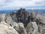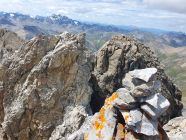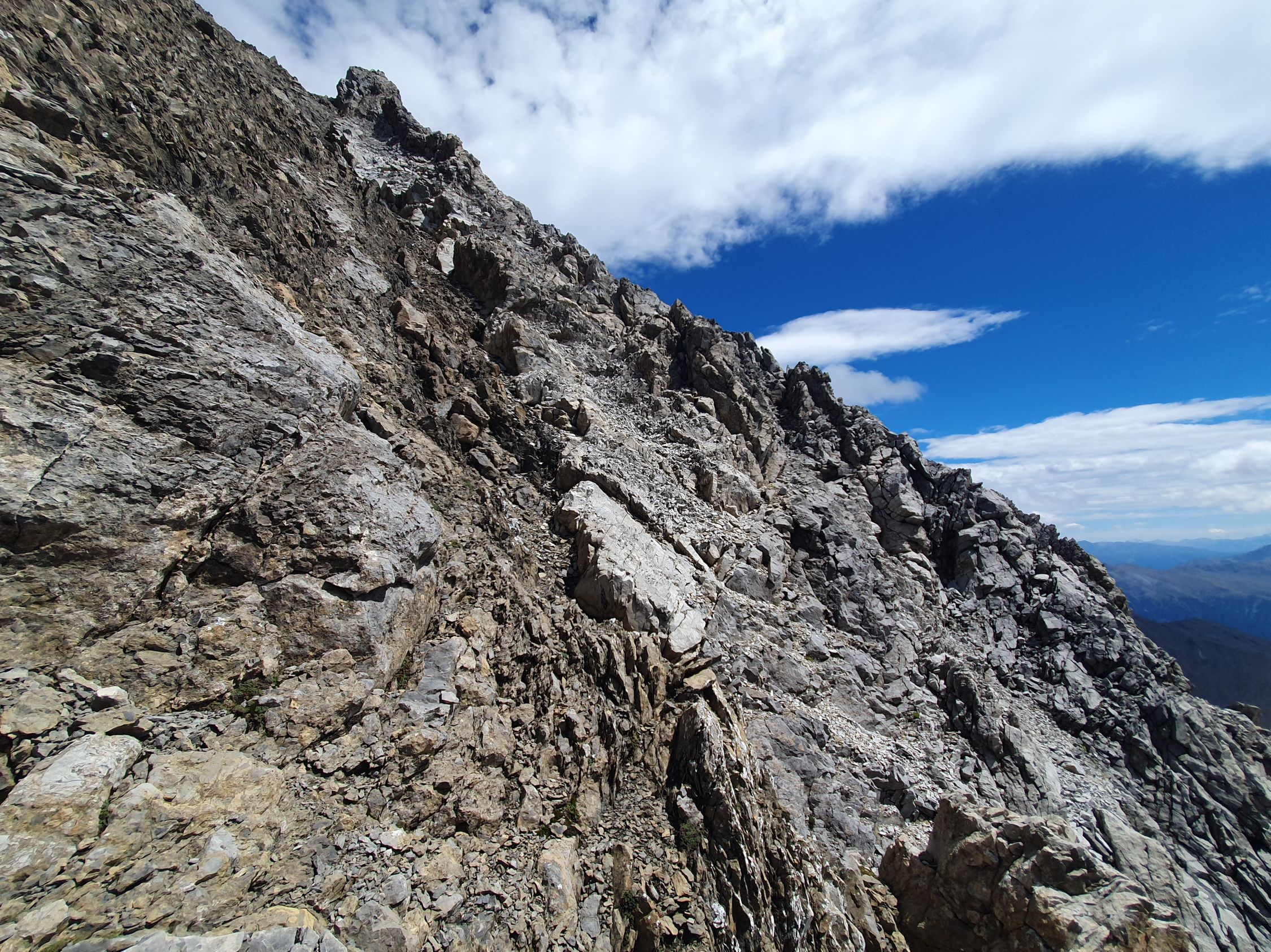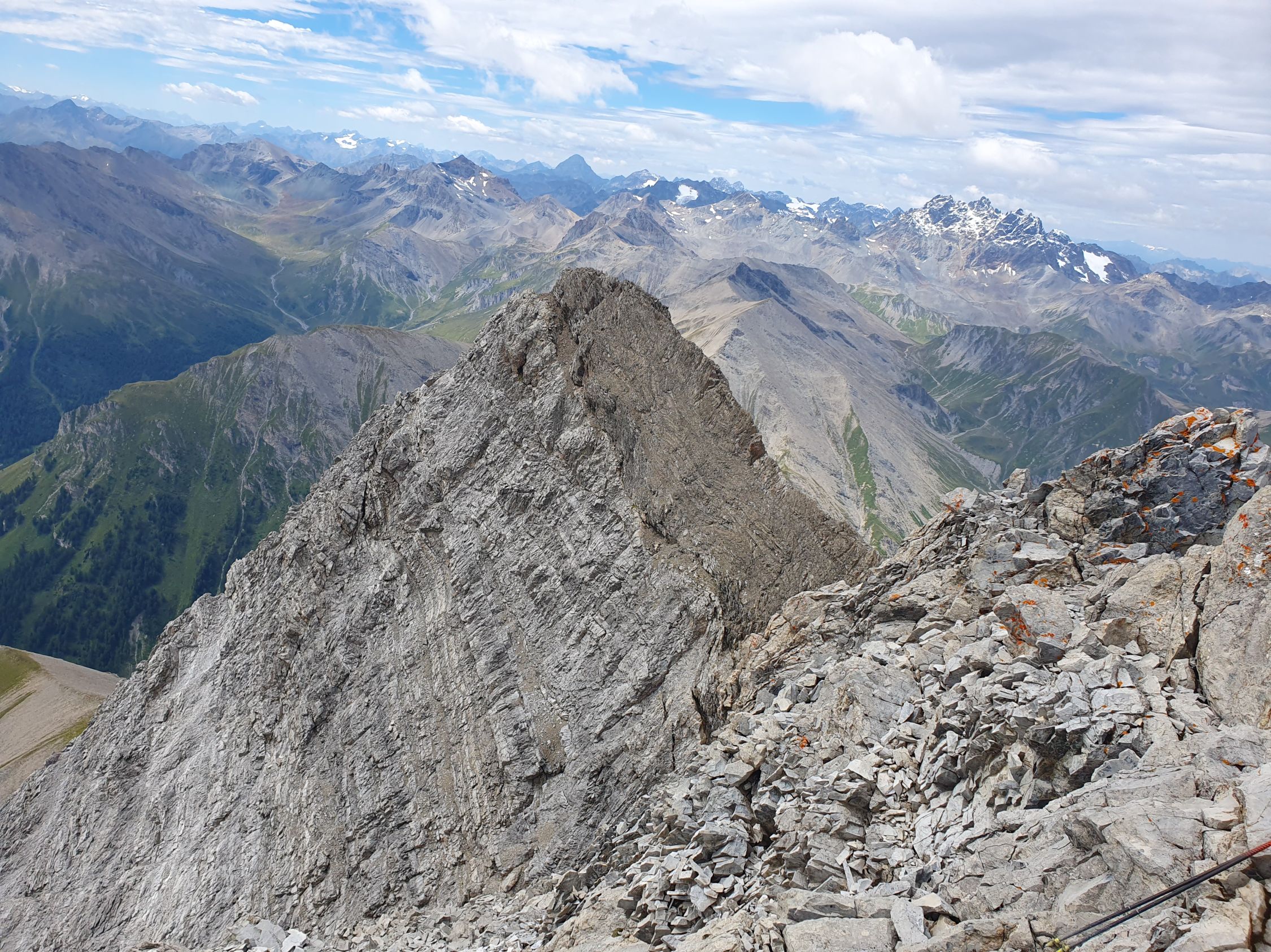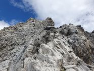 Der eigentliche Piz Tschütta ist der Westgipfel, resp. Hauptgipfel, der vom Mittelgipfel nur 10 Metern entfernt ist und weist einen sehr kleinen Steinmann auf. Aber eine gemeine senkrechte 10 Meter tiefe Wand trennt diese beiden Zacken. Aufgrund der fehlenden Tritte sah da ein Hinabklettern ohne Seil unmöglich aus. Es ist zum Greifen nah und um einen Meter höher! Dort wäre ich auch gerne. Doch wie komme ich hin? Ich versuche es! Ich steige rund 30 Hm vom Mittelgipfel diesen «S-Grat» direkt ab bis zu einem kleinen Schuttband, der in Richtung Osten erkennbar ist und sich nach NE in die sehr steile Rinne zwischen den beiden Zacken (Mittel- und Hauptgipfel) hinabzieht. Auf sehr leiser Sohle traversiere ich diesen schuttbeladenen Band, v.a. die steile Rinne (T5+, I), und steige auf der anderen Seite über viel Schutt ziemlich unschwierig zum Hauptgipfel auf (T5-, I). Nach nur 15 Minuten stehe ich nun schon tatsächlich auf dem Hauptgipfel. Nun habe ich keine Wünsche mehr offen. Die Sicht vom Haupt- zum Mittelgipfel bestätigt, dass die 10 Meter senkrechte Wand extrem schwierig zum hinabklettern gewesen wäre, resp. ohne Seil nicht möglich! Nun stehe ich durch diese kleine Umrundung tatsächlich einen Meter höher und geniesse die sich wieder herausschauende Sonne!