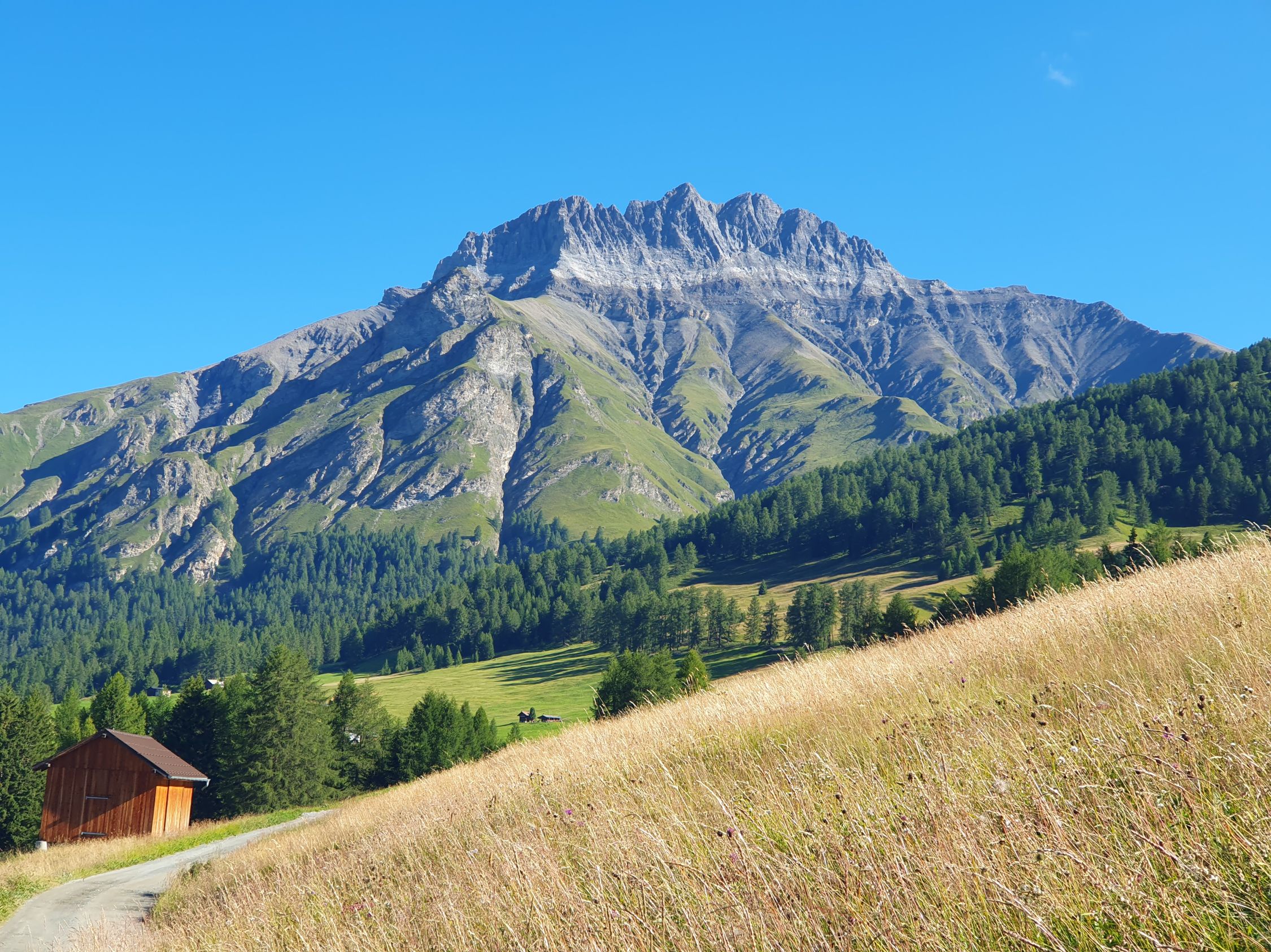 Heute mit dem E-Bike hoch bis zur Alp Pradgiant (P2078). Achtung, hier nicht die weitere Kehre auf dem steilem Alpweg nach Fains (P2185) nehmen, da diese in die falsche Richtung geht, resp. die obere Traverse hinab zu P2255 weglos vermutlich mehr Zeit beanspruchen würde.
