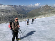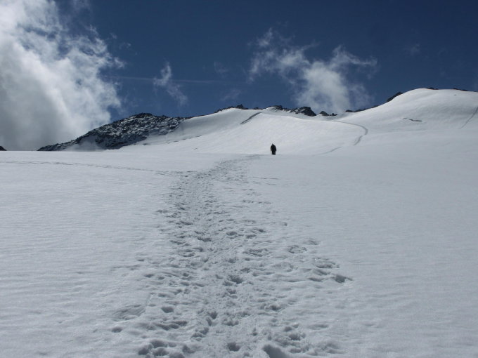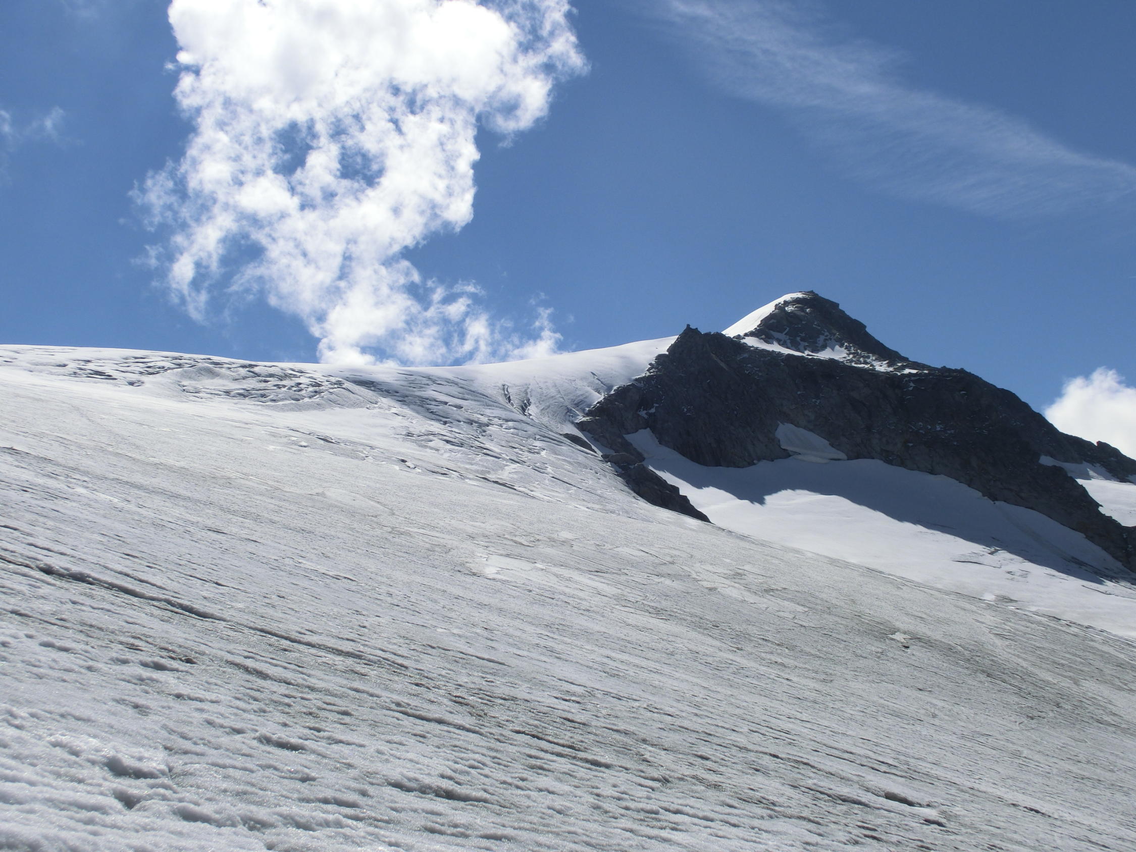 Verhältnisse gut, Gletscher im unteren Bereich aper, mittig eine Spaltenzone, oben Firn;