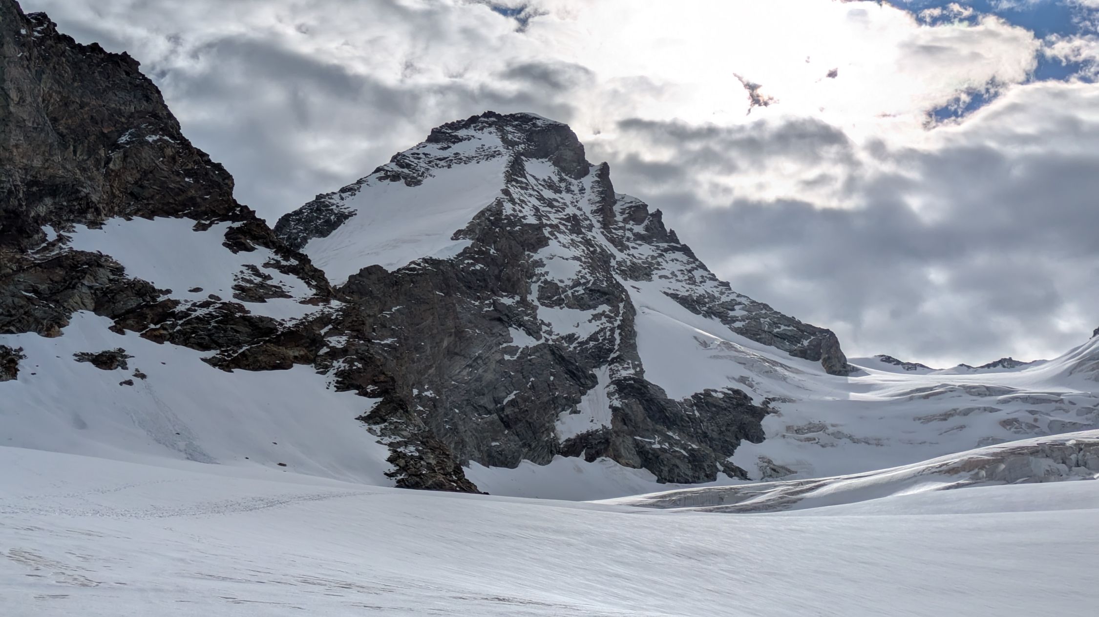 Gletscher und Flanke mit Trittfirn. Felsteil mit Schnee