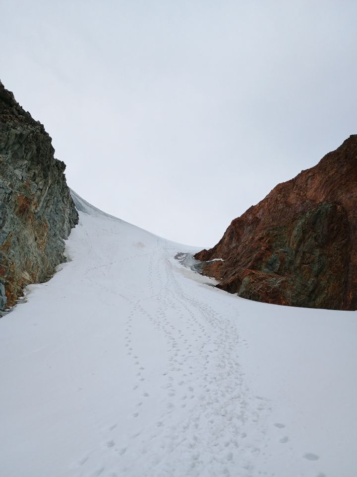 Abstieg von Col de la Tsa wird langsam eisiger. Geht aber jetzt noch gut (Eis kann im Schnee noch umgangen werden).
