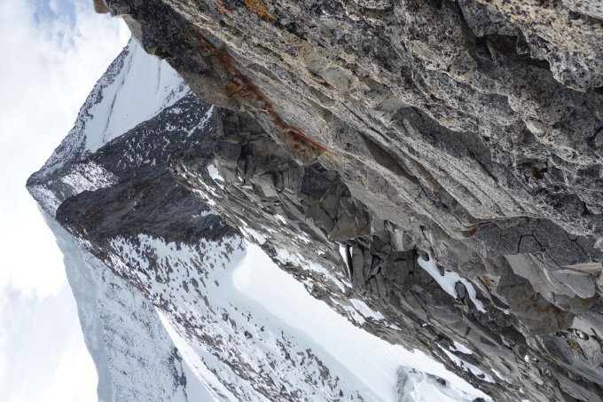 Brauchbare Verhältnisse obwohl einiger Schnee am Grat und stürmischer Wind. Zwei Bewerber sind vor uns am Einstieg umgedreht. Die Verhältnisse waren aber besser als der Augenschein am Einstieg. Wir haben nur kurz am zweiten Aufschwung Steigeisen und Eisgerät benötigt und nur zwei stellen gesichert.