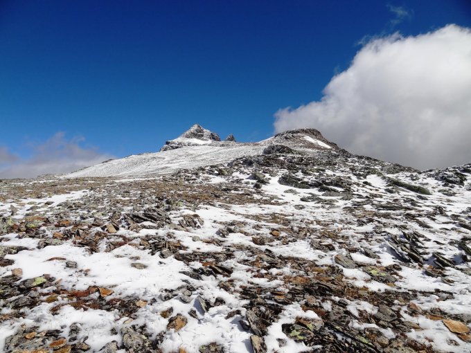 Weg schneefrei und trocken. Ab ca 2500 m sind Schattenhänge mit Neuschnee bedeckt. Schneehöhe unterschiedlich (Wind), aber nicht bedeutend.
