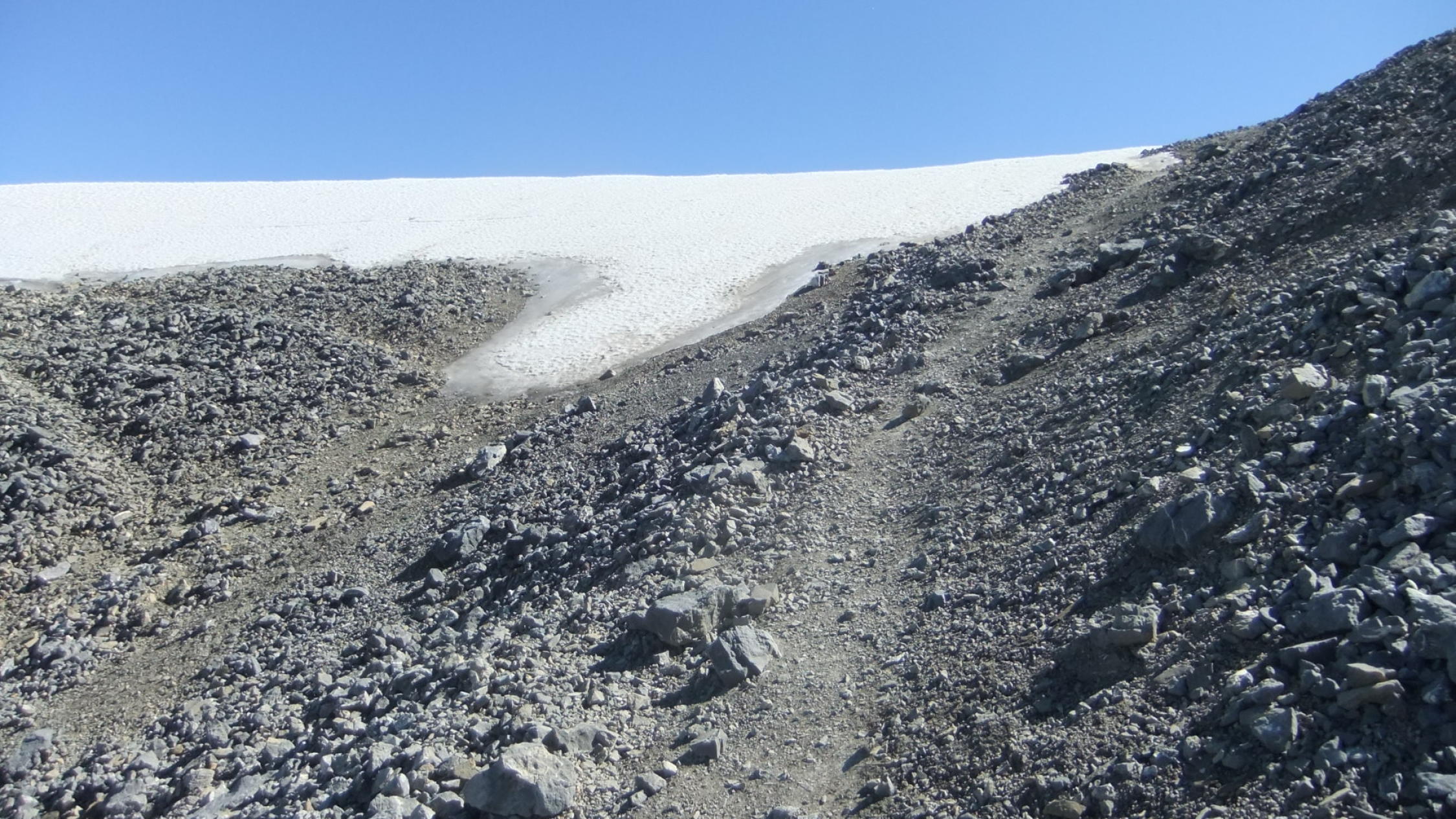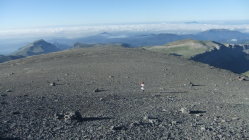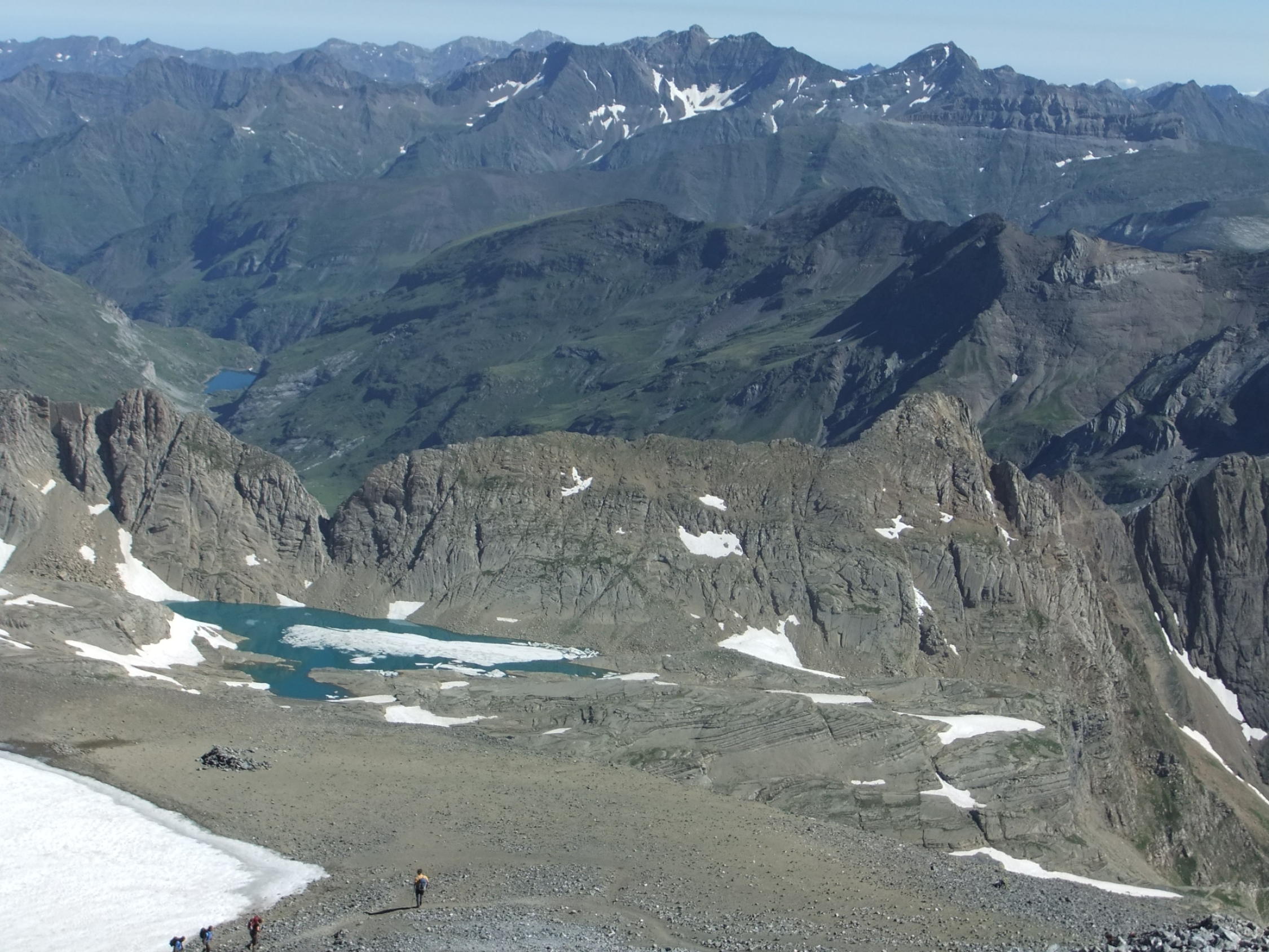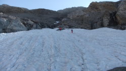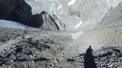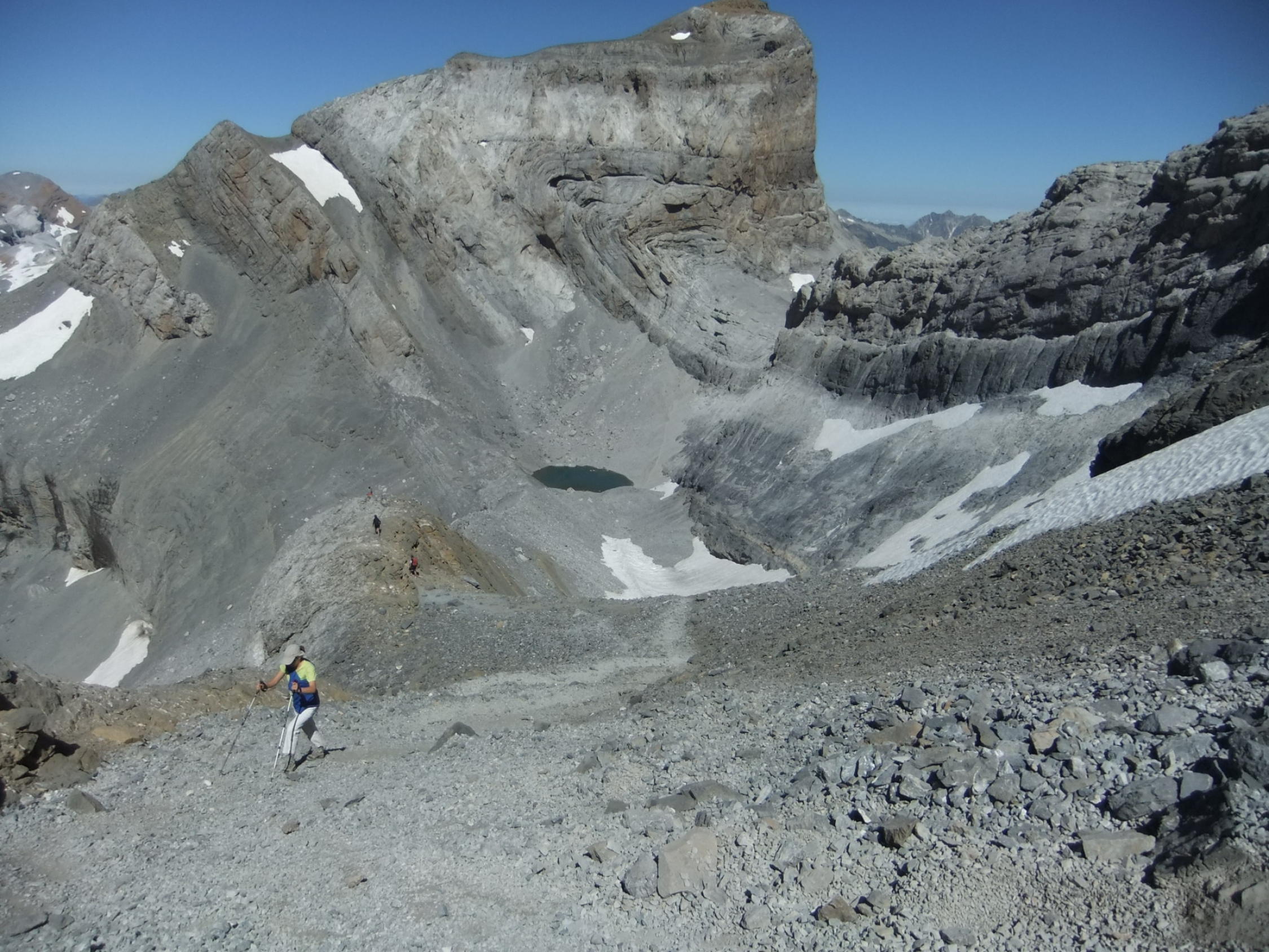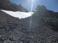 Steile Wegabschnitte mit leichten Kletterpassagen nach der Hütte. Im großen Blocklabyrinth ist Orientierungssinn erforderlich. Mühsam südseitiger Gipfelanstieg über kleingeröllige 35° steile Rampe (Escupidera), in der auch im Sommer Schnee liegt. Nach der Kletterpassage verstieg ich mich im Block-Labyrinth zu sehr rechts (östlich) mit einem spanischen Steigpärchen. Wir waren fast schon auf dem Soum de Ramond, bis wir's merkten. Der "Umweg" kostete über eine Stunde.