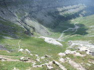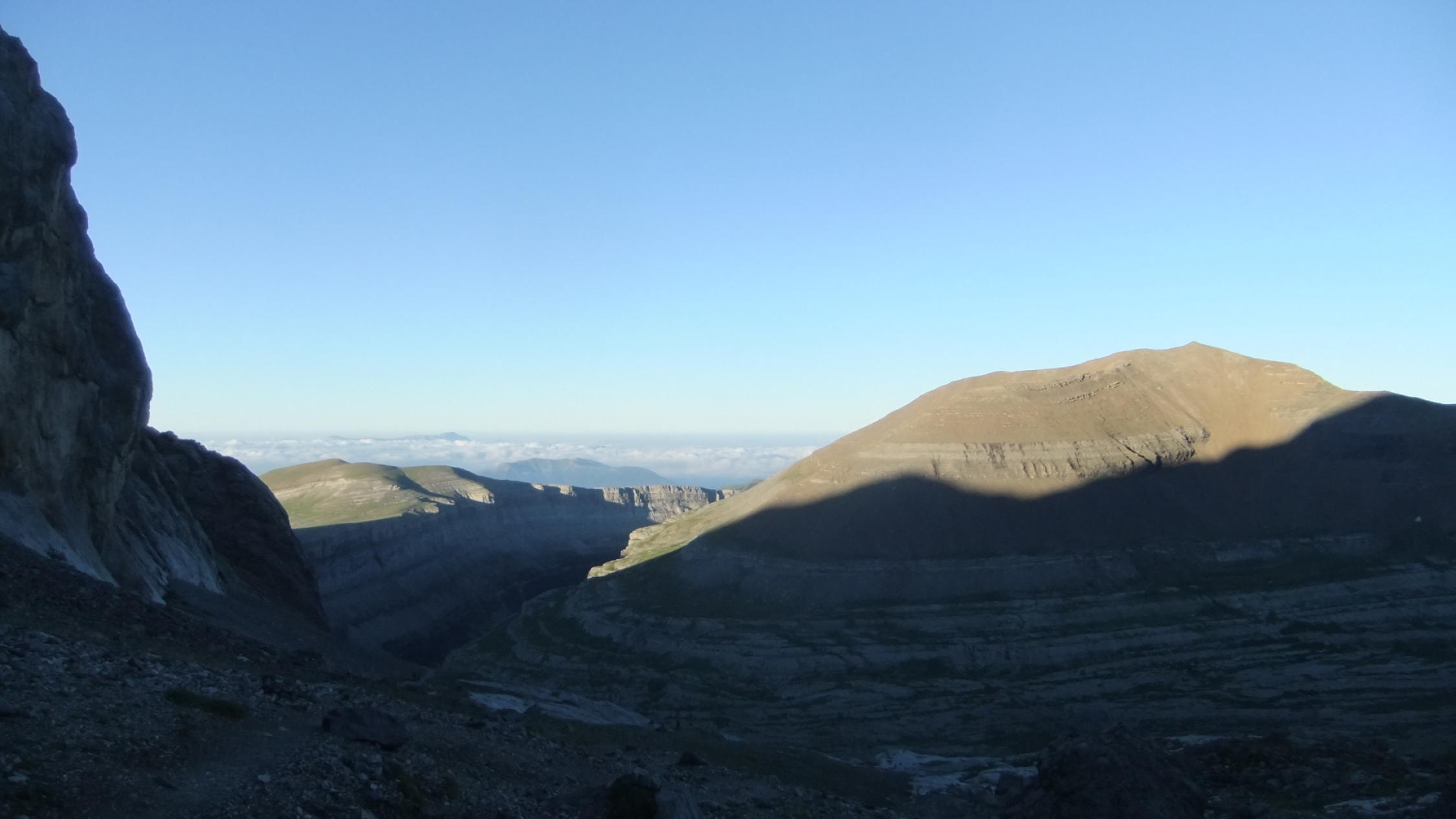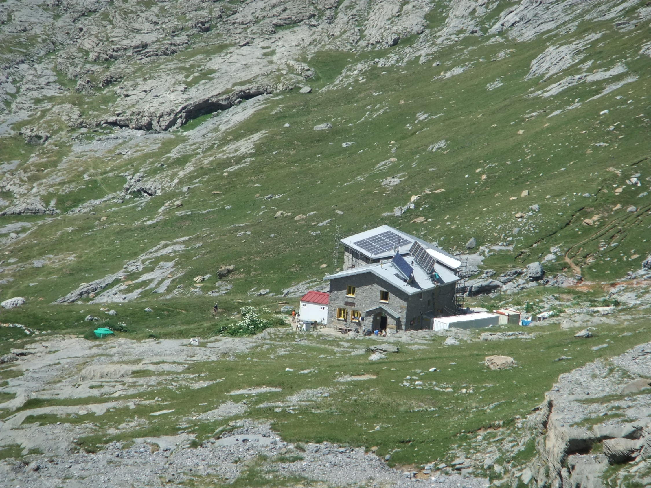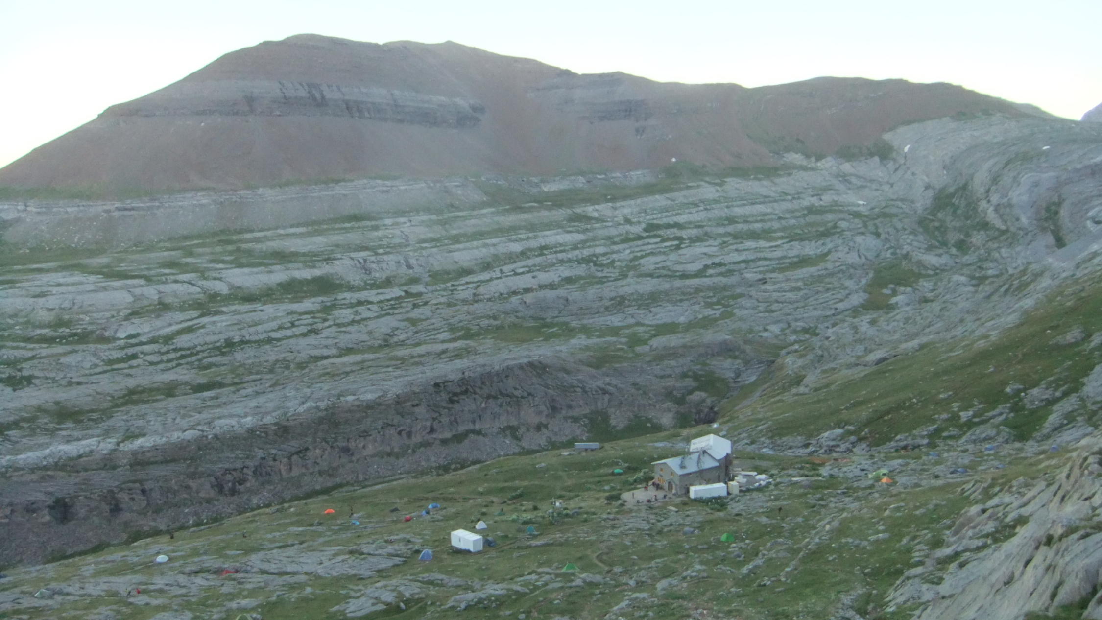 Da ich die Tour an einem Tag unternehmen wollte, der erste Zubringerbus jedoch erst ab 06:00 Uhr von Torla losfährt, verzichtete ich auf diesen und absolvierte auch die Straße nach Pradera de Ordesa zu Fuß. Ich startete darum um 00:00 Uhr am Campingplatz San Antón nördlich von Torla. Um 06:45 Uhr kam ich zum Frühstück auf der Góriz-Hütte an und zog mir erst mal 5 Pulver-Kaffees mit "spanischer Ovomaltine" rein. Dort herrschte gerade allgemeine Aufbruchstimmung.