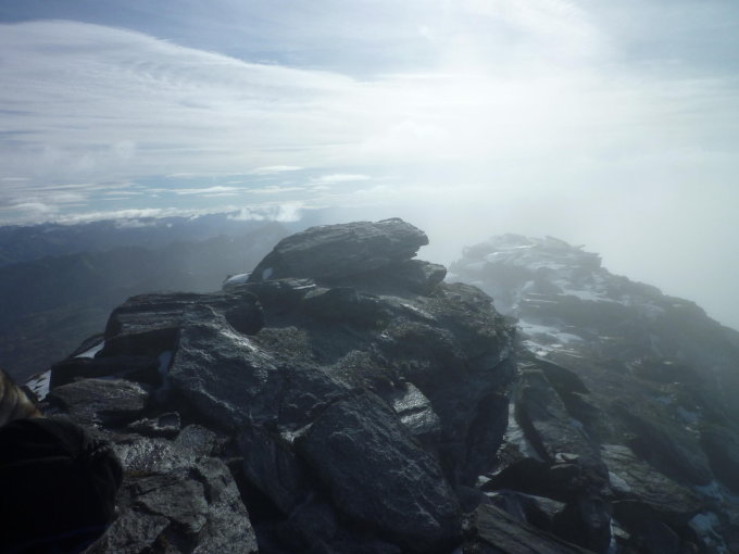 Auf dem Gipfelgrat sehr rutschige Steine und gefrorener Untergrund. Teils schneedurchsetzt. Sind den Gipfelgrat mit Steigeisen gegangen. Ohne fast nicht möglich.